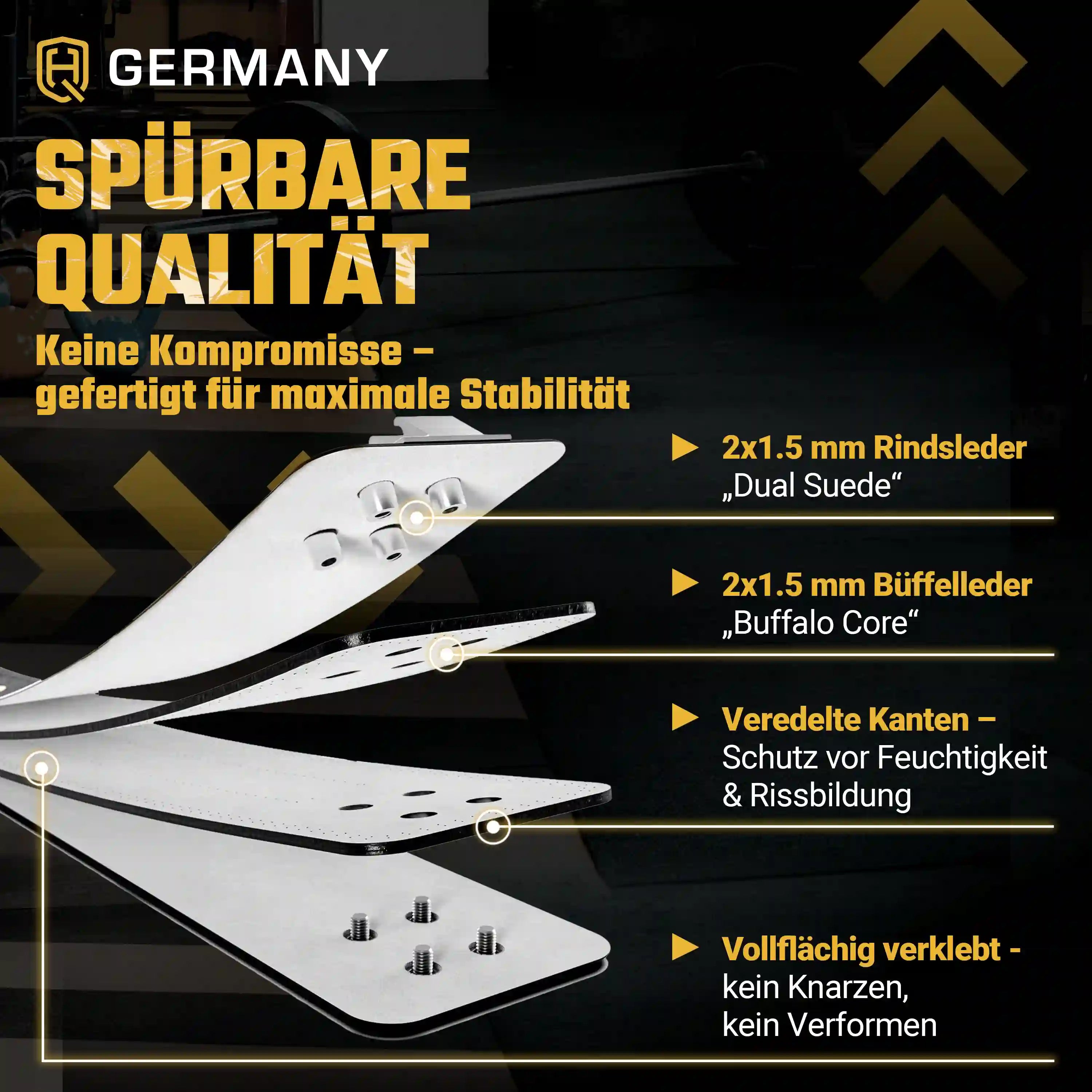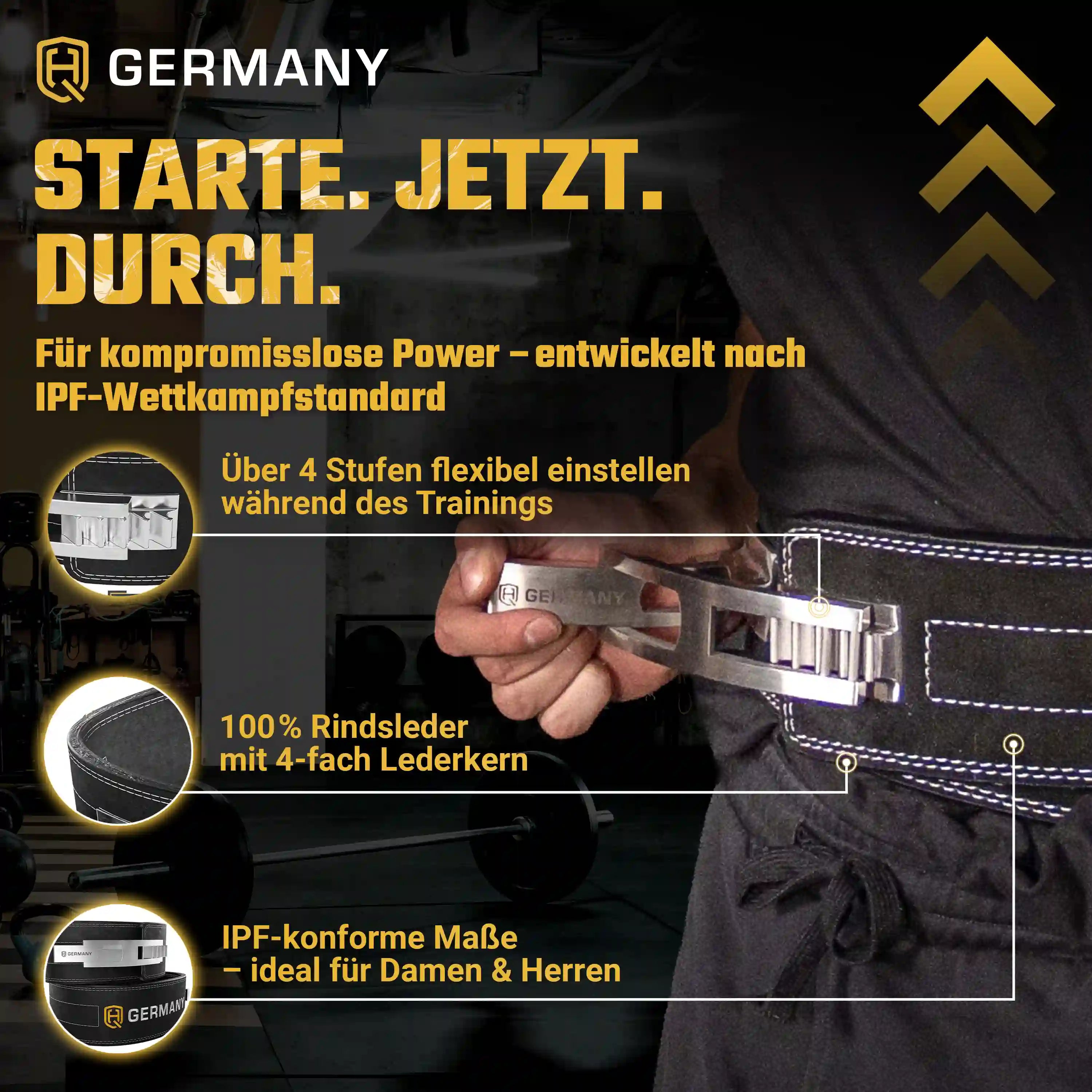 Entdecke unseren Premium Powerlifting Gürtel, der für anspruchsvolles Training und maximale Leistung entwickelt wurde. Hergestellt aus 100 % Rindsleder, überzeugt dieser Gürtel durch seine robusten Materialien und eine feinsäuberliche Verarbeitung mit doppelläufigen Nähten. Jede Lederschicht ist sorgfältig verklebt, um sicherzustellen, dass dein Gürtel langfristig geschmeidig und knarzfrei bleibt. Die Kanten unseres Deadlift Belts sind präzise veredelt, um zu verhindern, dass Feuchtigkeit die Lederschichten an der Schnittkante angreift. Dies erhöht nicht nur die Langlebigkeit des Gürtels, sondern sorgt auch für zusätzliche Stabilität während deiner Trainingseinheiten. Der aus 100 % Edelstahl bestehende Spannverschluss lässt sich über 4 Stufen flexibel anpassen, sodass du den perfekten Sitz erreichst. Dank der Möglichkeit, die Position der Schnalle über eine Verschraubung anzupassen, kannst du die Passform individuell auf deine Bedürfnisse abstimmen. Unser Powerlifting Gürtel entspricht den IPF-Normen und ist sowohl für Damen als auch für Herren optimal auf das Gewichtheben abgestimmt. Ein gesticktes Premium-Logo garantiert nicht nur einen stilvollen Look, sondern hält auch ein Leben lang. Vertraue in Qualität und Design – mit unserem Premium Powerlifting Gürtel bist du bestens gerüstet für deine intensiven Trainingseinheiten!
