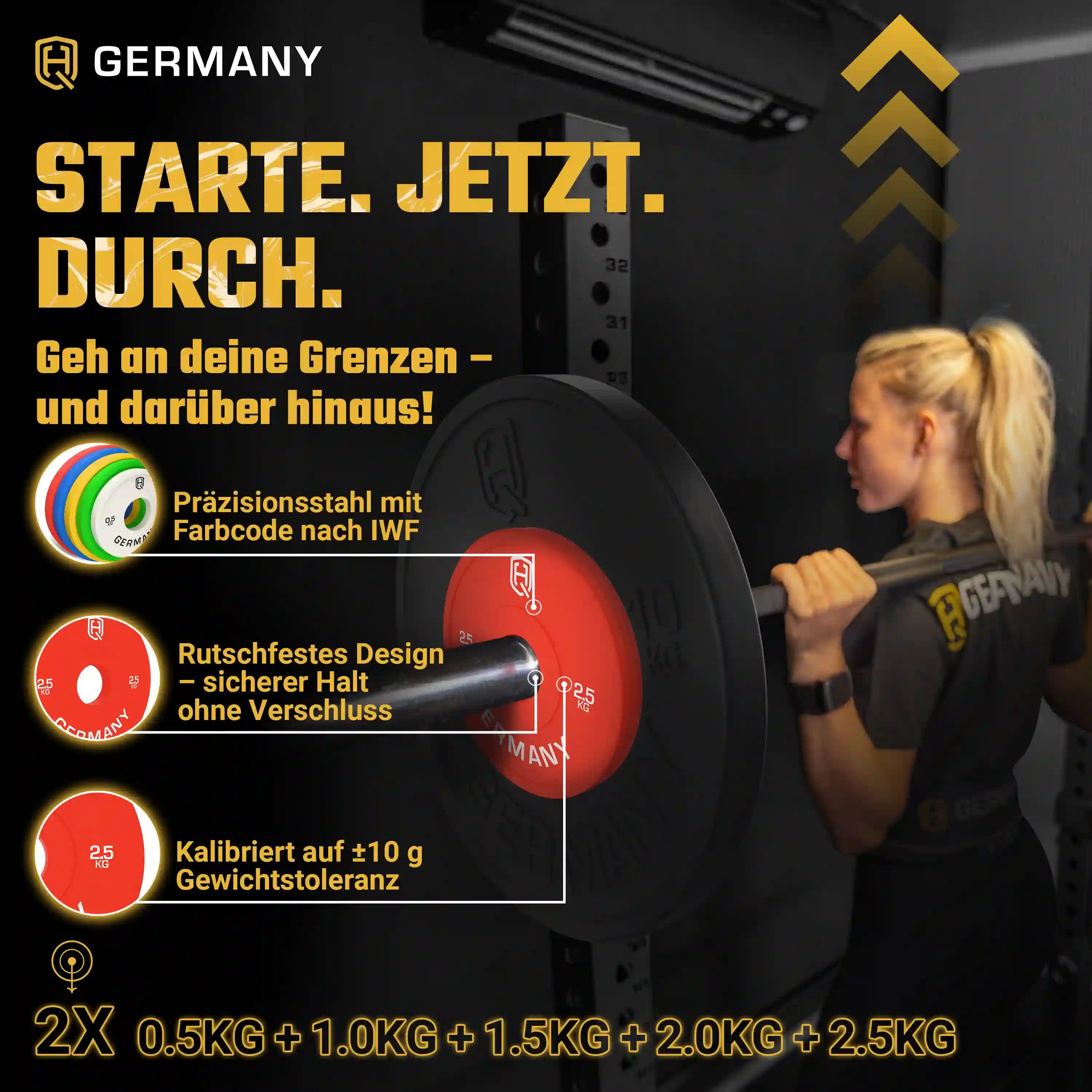 Die Fractional Plates von HQ Germany sind die perfekte Ergänzung für dein Training, um kontinuierliche Fortschritte zu erzielen. Diese hochwertigen Gewichtsscheiben sind für präzises Training konzipiert und bieten dir eine Gewichtstoleranz von ±10 Gramm, sodass du deine Fortschritte genau verfolgen kannst. Dank des innovativen Friction-Grip Designs bleiben die Fractional Plates auch ohne Hantelverschluss sicher auf der Stange, was dir einen schnellen und unkomplizierten Austausch während deiner Trainingseinheiten ermöglicht. Mit einem Durchmesser von 50 mm entsprechen sie dem internationalen IWF-Farbcode und sind mit allen gängigen 50 mm Hantelstangen kompatibel. Entscheide dich für die Fractional Plates, um dein Training effektiver zu gestalten und deine Ziele zu erreichen!