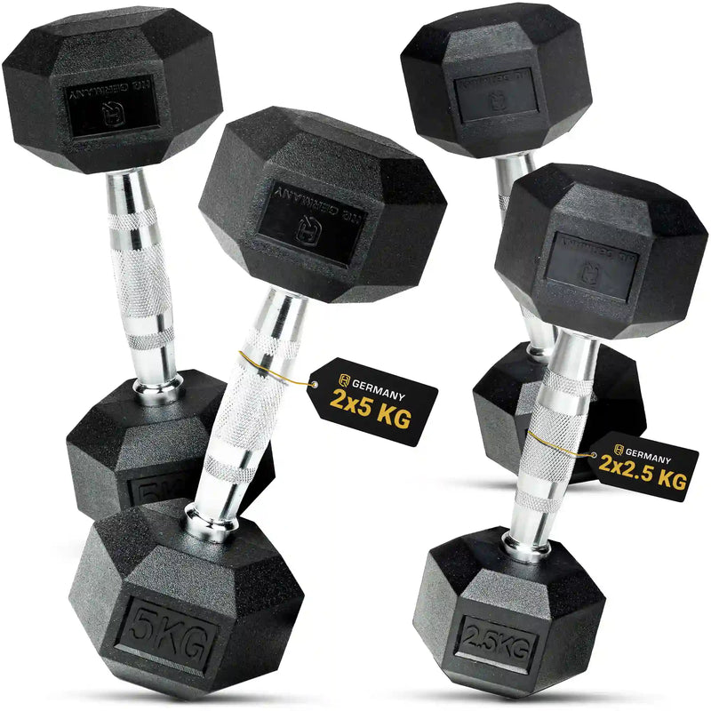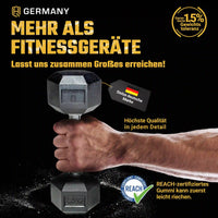Entwickelt für höchste Ansprüche, bieten unsere Hexagon Kurzhanteln präzise Gewichtungen für ein effektives Krafttraining und eignen sich für Einsteiger ebenso wie für Fortgeschrittene. Die Hanteln verfügen über einen großzügigen Durchmesser sowie eine widerstandsfähige Chrombeschichtung, die auch bei intensiven Workouts einen sicheren und komfortablen Griff gewährleistet. Das verwendete PVC-Gummi ist REACH-konform und wurde auf schädliche Stoffe geprüft, um hohe Sicherheits- und Qualitätsstandards zu erfüllen. Produktionsbedingt kann es nach dem Auspacken zu einer leichten Ölschicht auf der Oberfläche kommen, die sich einfach mit einem fettlöslichen Reinigungsmittel entfernen lässt. Sollte ein leichter Eigengeruch wahrnehmbar sein, ist dieser unbedenklich und verschwindet in der Regel, wenn die Hanteln 1–2 Tage an der frischen Luft ausgelüftet werden. Mit den Hexagon Kurzhanteln von HQ Germany setzt du auf langlebige und zuverlässige Trainingsgeräte.