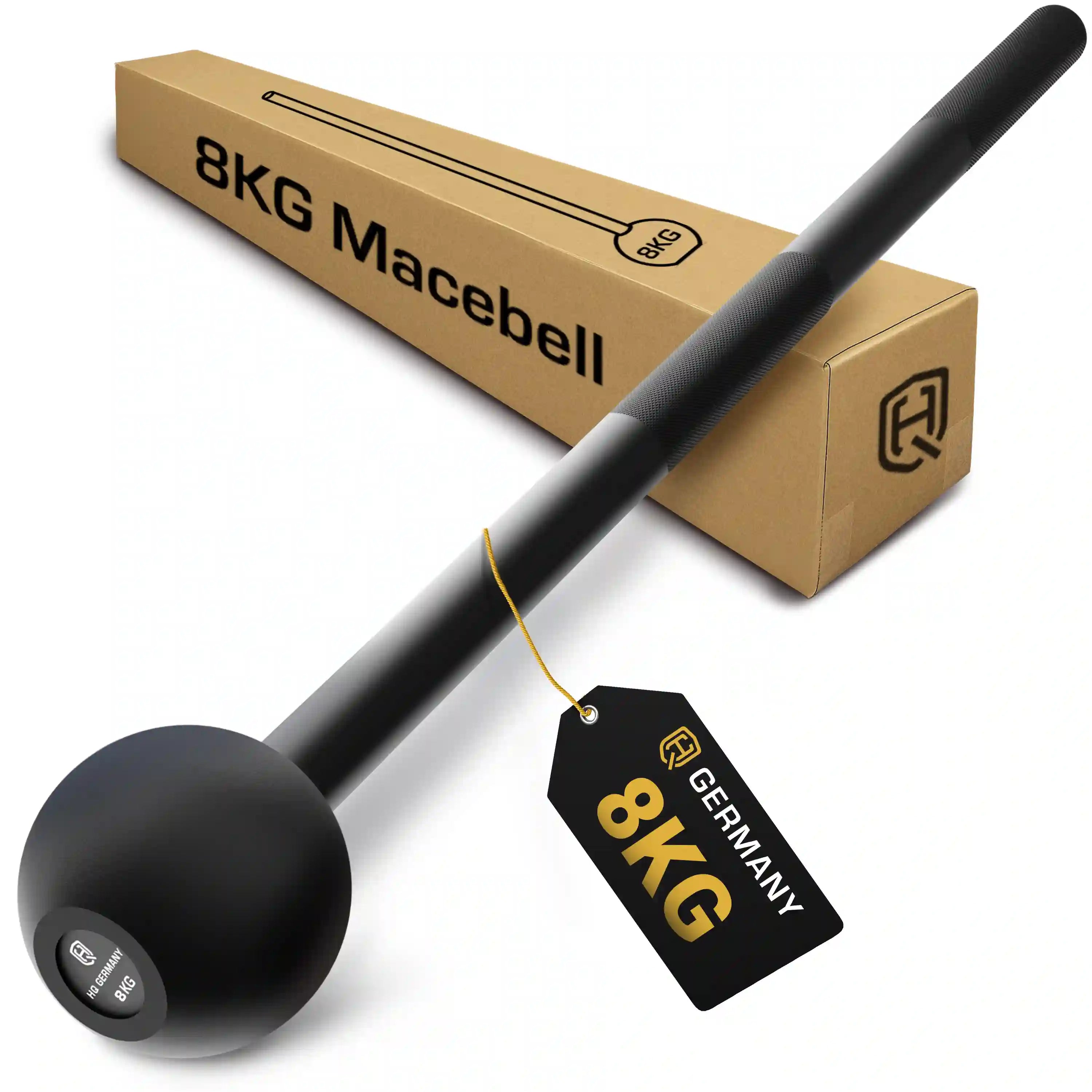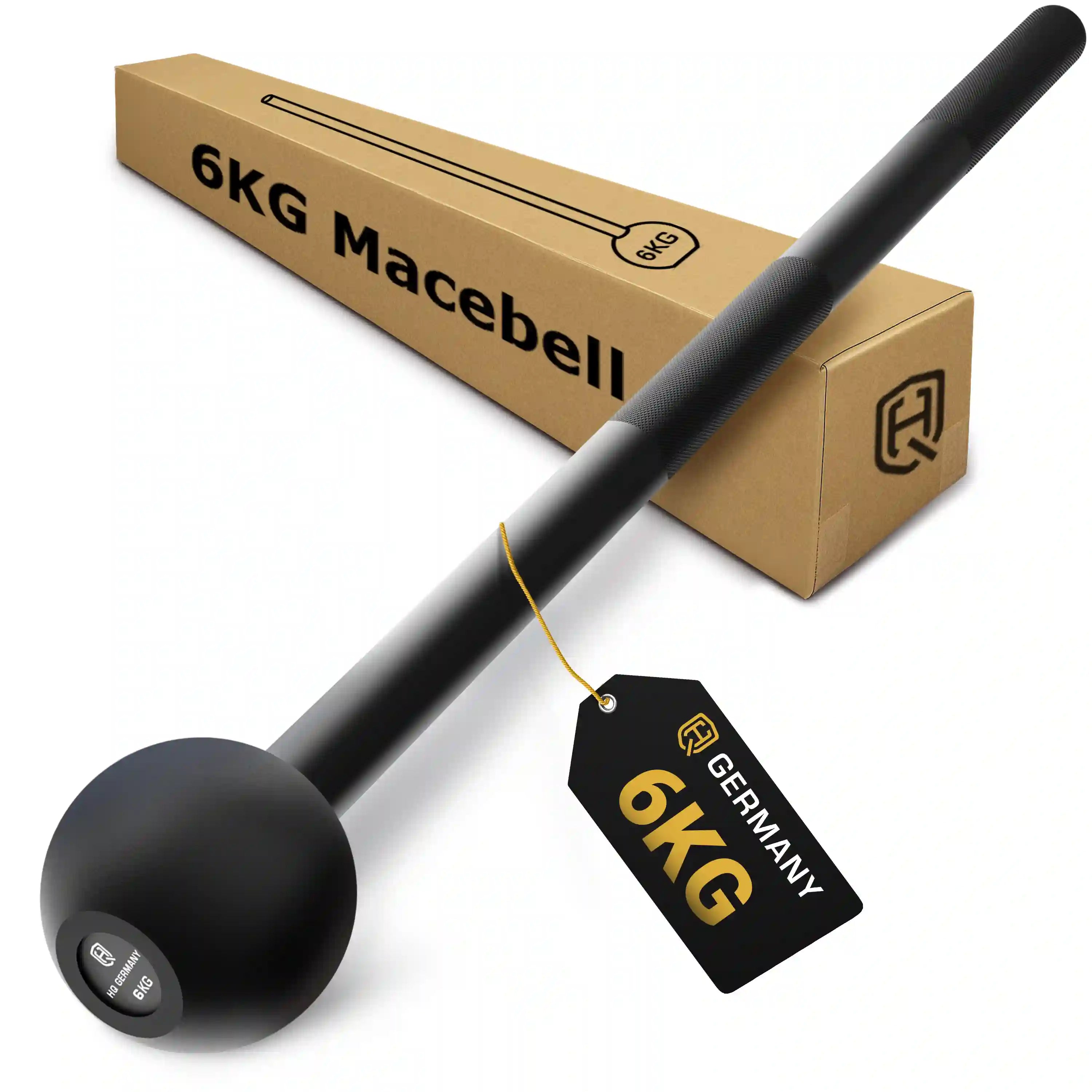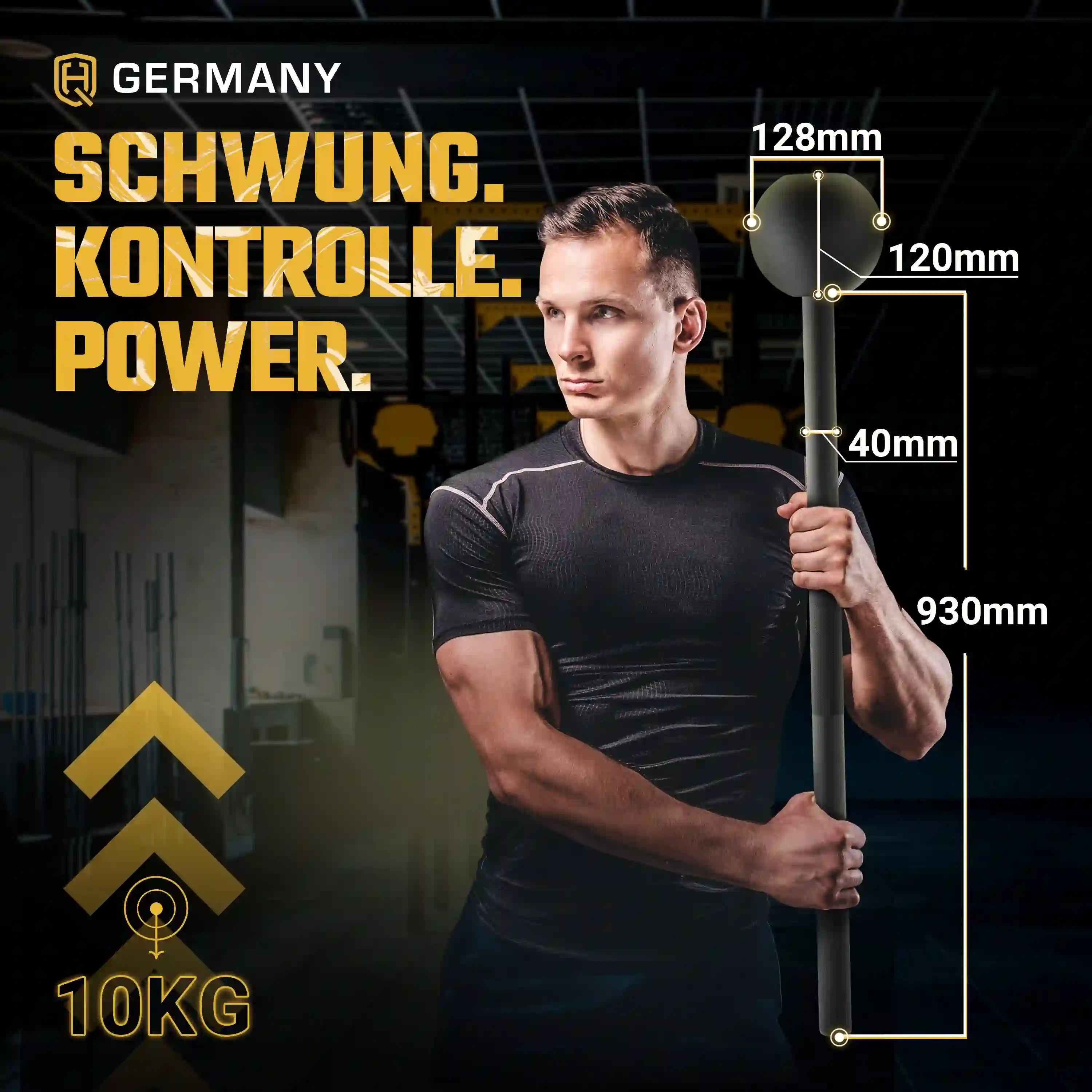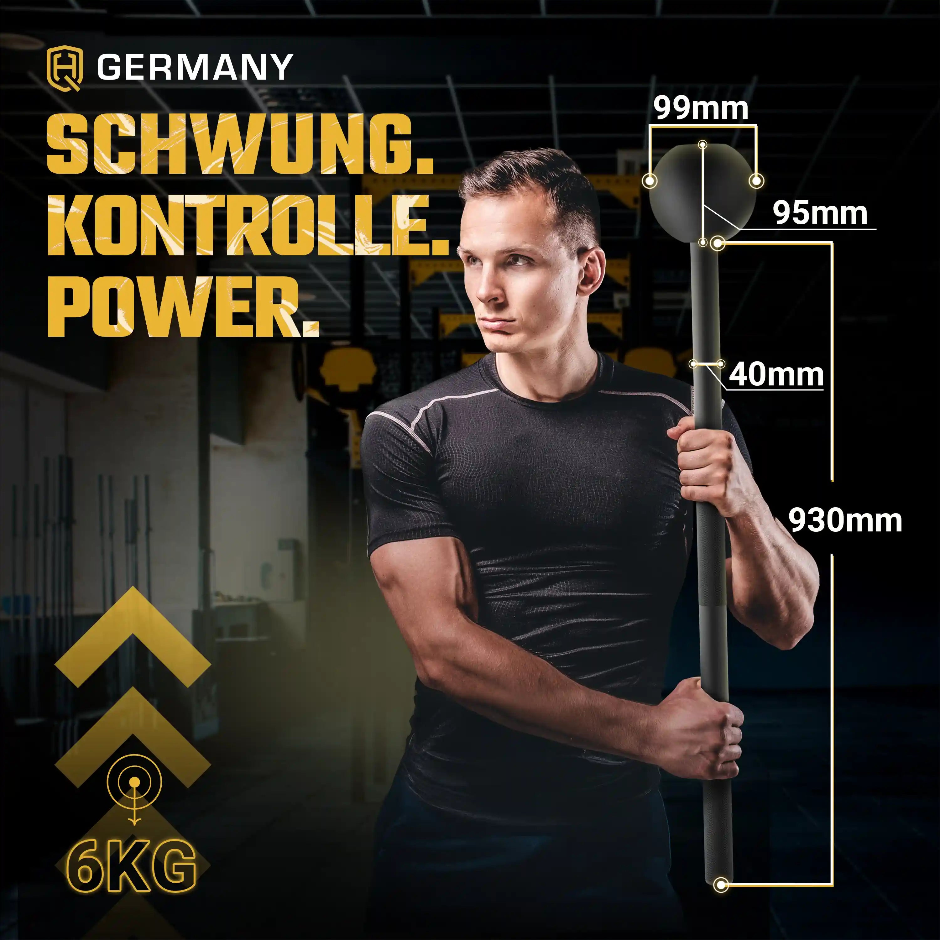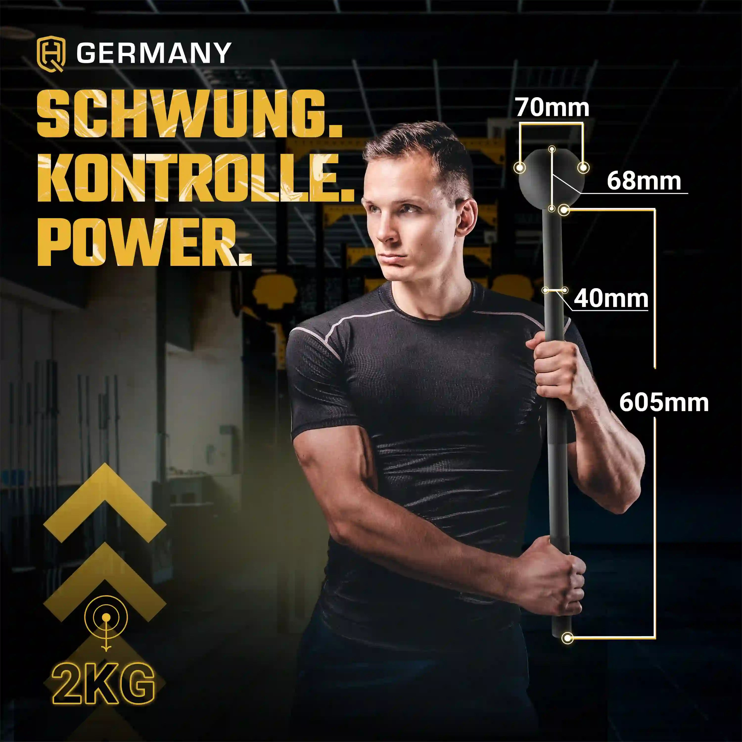 Die Macebells von HQ Germany sind perfekt für funktionelles Ganzkörpertraining – von Mobilitätsübungen bis hin zu intensivem Kraft- und Konditionstraining. Erhältlich in 2–10 kg bieten sie die ideale Progression für Einsteiger, Fortgeschrittene und Profis. Gefertigt aus massivem Qualitätsstahl und fest verschweißt, überzeugen die Macebells durch hohe Robustheit und eine Gewichtstoleranz von ±200 g. Die eingebrannte Pulverbeschichtung sorgt für eine langlebige, griffige Oberfläche, die selbst bei schweißtreibenden Workouts zuverlässig Halt gibt. Der Griff ist bei der 2-kg-Variante 605 mm lang mit Ø 32 mm; die 4-kg-Variante besitzt einen 700 mm langen Griff mit Ø 40 mm; ab 6 kg misst er dann 930 mm mit Ø 40 mm. Zwei eingepresste Knurling-Segmente bieten zusätzlichen Grip ohne scharfe Kanten. So vereinen die HQ Germany Macebells präzise Fertigung, Langlebigkeit und vielseitige Einsatzmöglichkeiten – das Trainingswerkzeug für Athleten, die mehr erwarten.