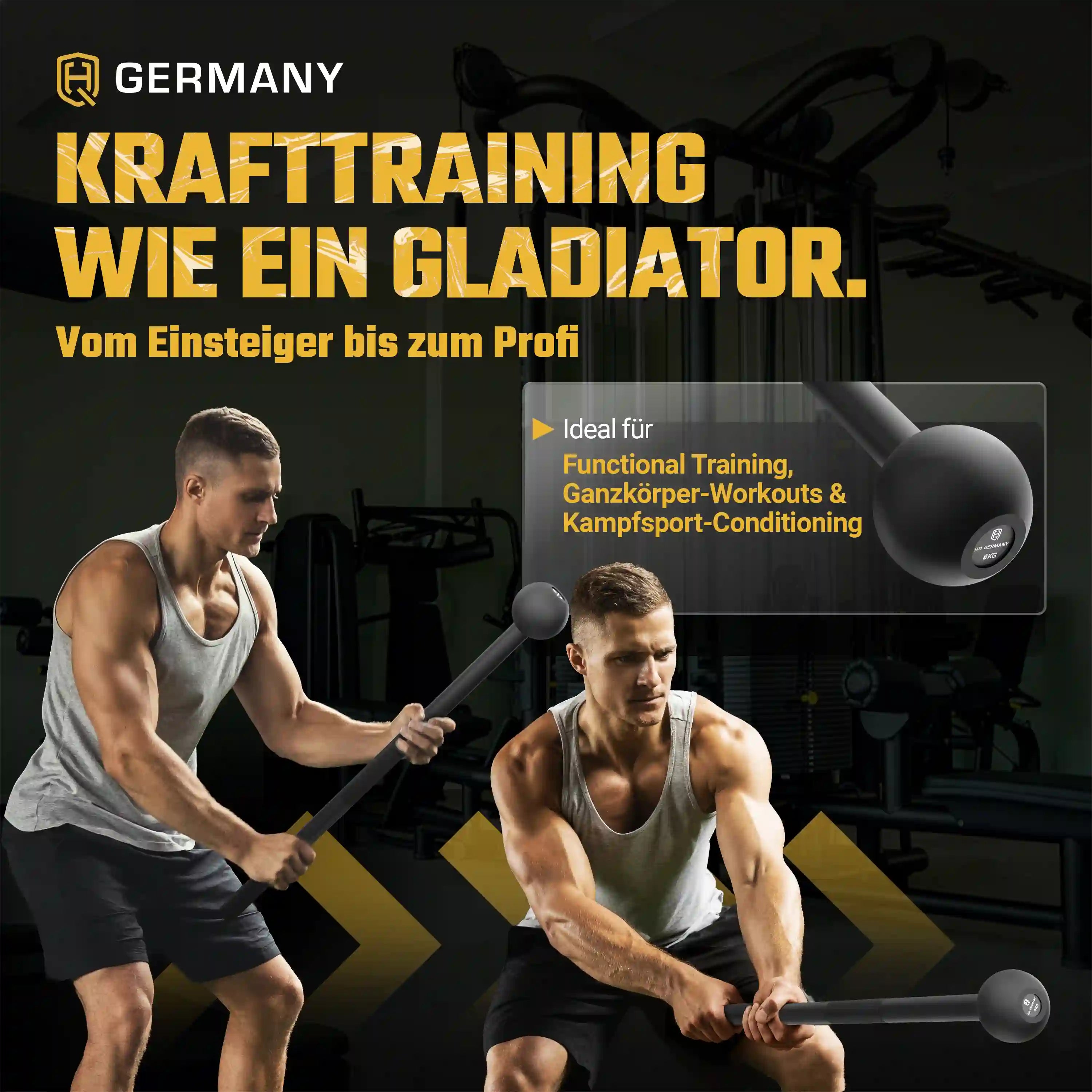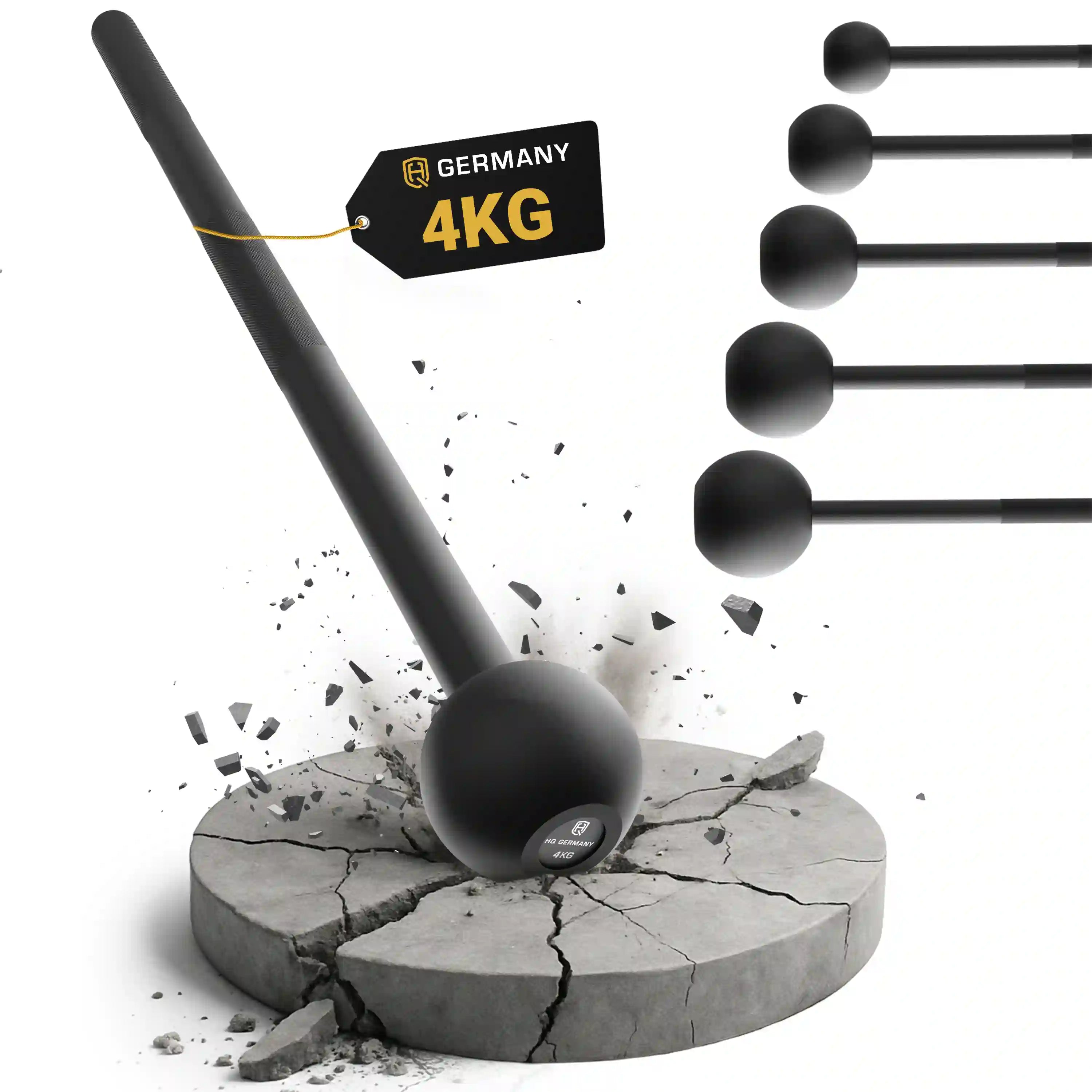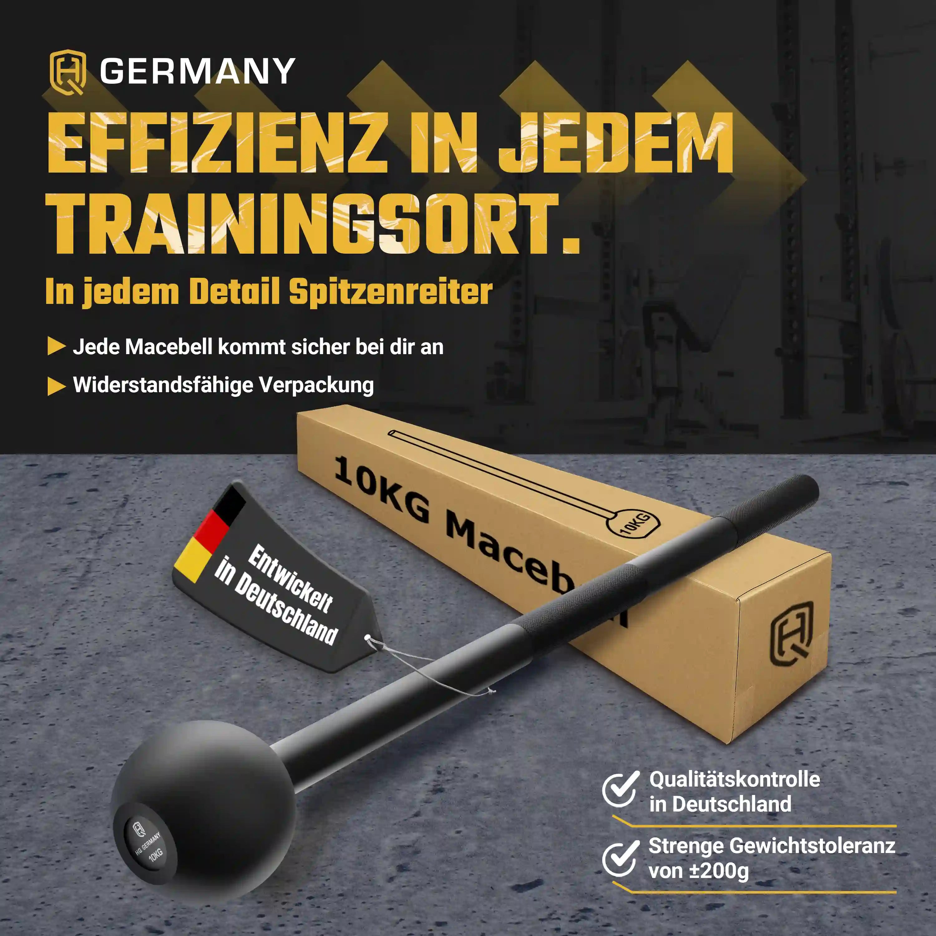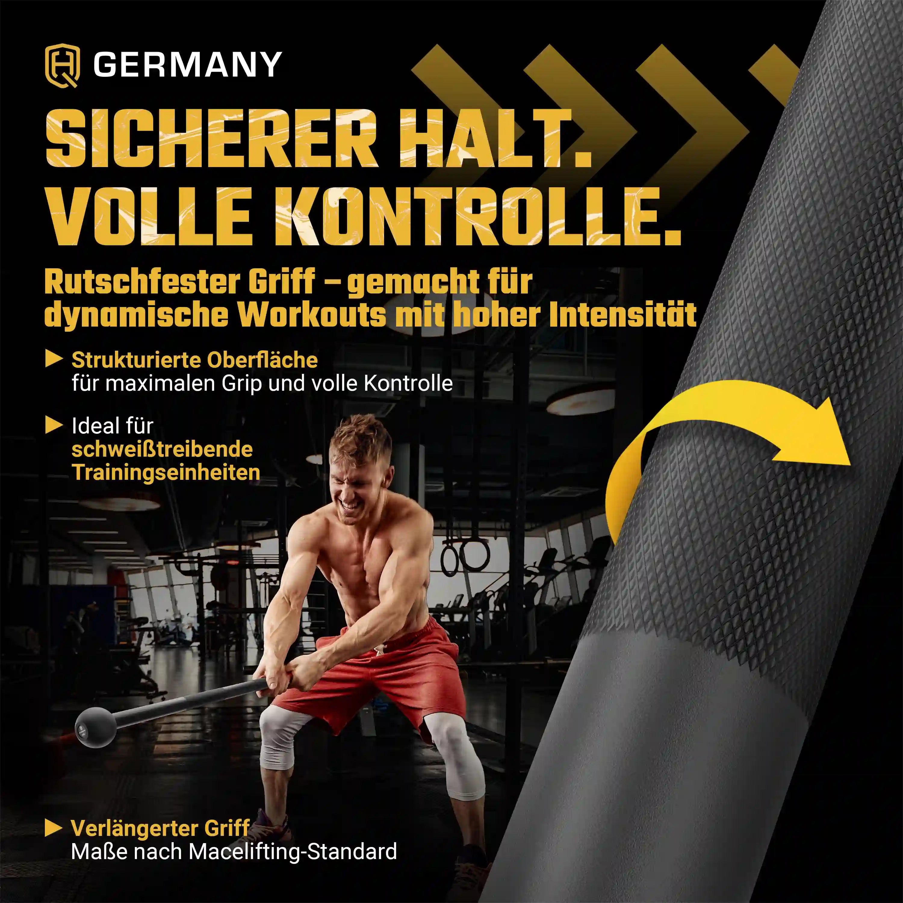 Die Macebells von HQ Germany sind perfekt für funktionelles Ganzkörpertraining – von Mobilitätsübungen bis hin zu intensivem Kraft- und Konditionstraining. Erhältlich in 2–10 kg bieten sie die ideale Progression für Einsteiger, Fortgeschrittene und Profis. Gefertigt aus massivem Qualitätsstahl und fest verschweißt, überzeugen die Macebells durch hohe Robustheit und eine Gewichtstoleranz von ±200 g. Die eingebrannte Pulverbeschichtung sorgt für eine langlebige, griffige Oberfläche, die selbst bei schweißtreibenden Workouts zuverlässig Halt gibt. Der Griff ist bei der 2-kg-Variante 605 mm lang mit Ø 32 mm; ab 4 kg misst er 930 mm mit Ø 40 mm. Zwei eingepresste Knurling-Segmente bieten zusätzlichen Grip ohne scharfe Kanten. So vereinen die HQ Germany Macebells präzise Fertigung, Langlebigkeit und vielseitige Einsatzmöglichkeiten – das Trainingswerkzeug für Athleten, die mehr erwarten.
