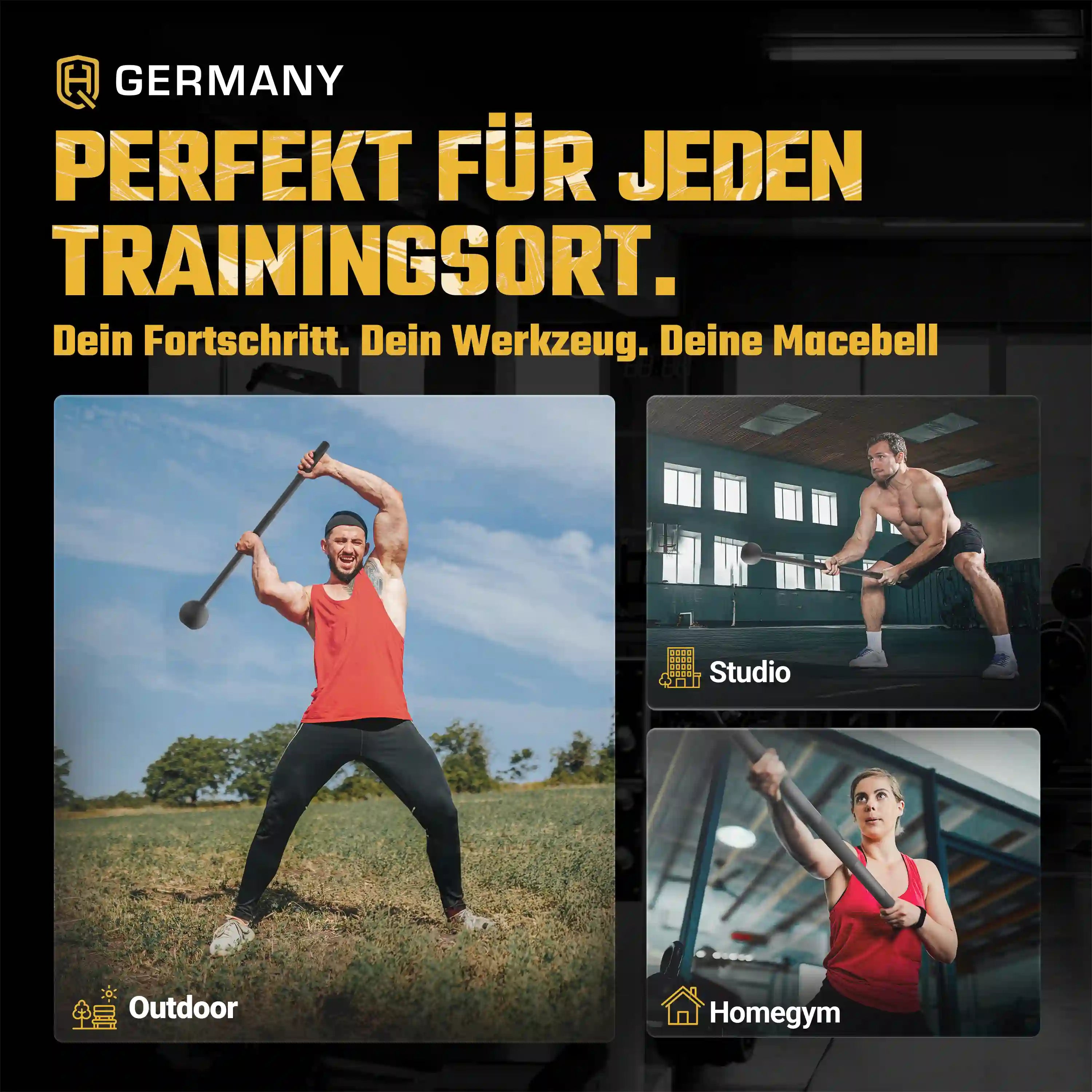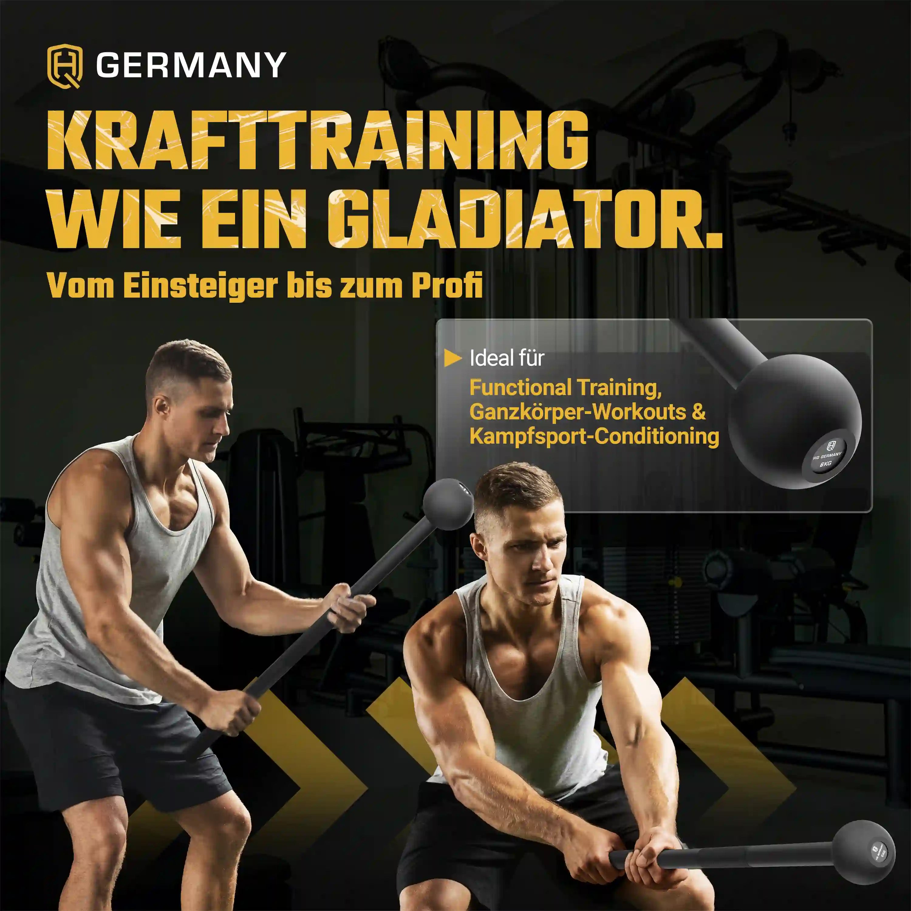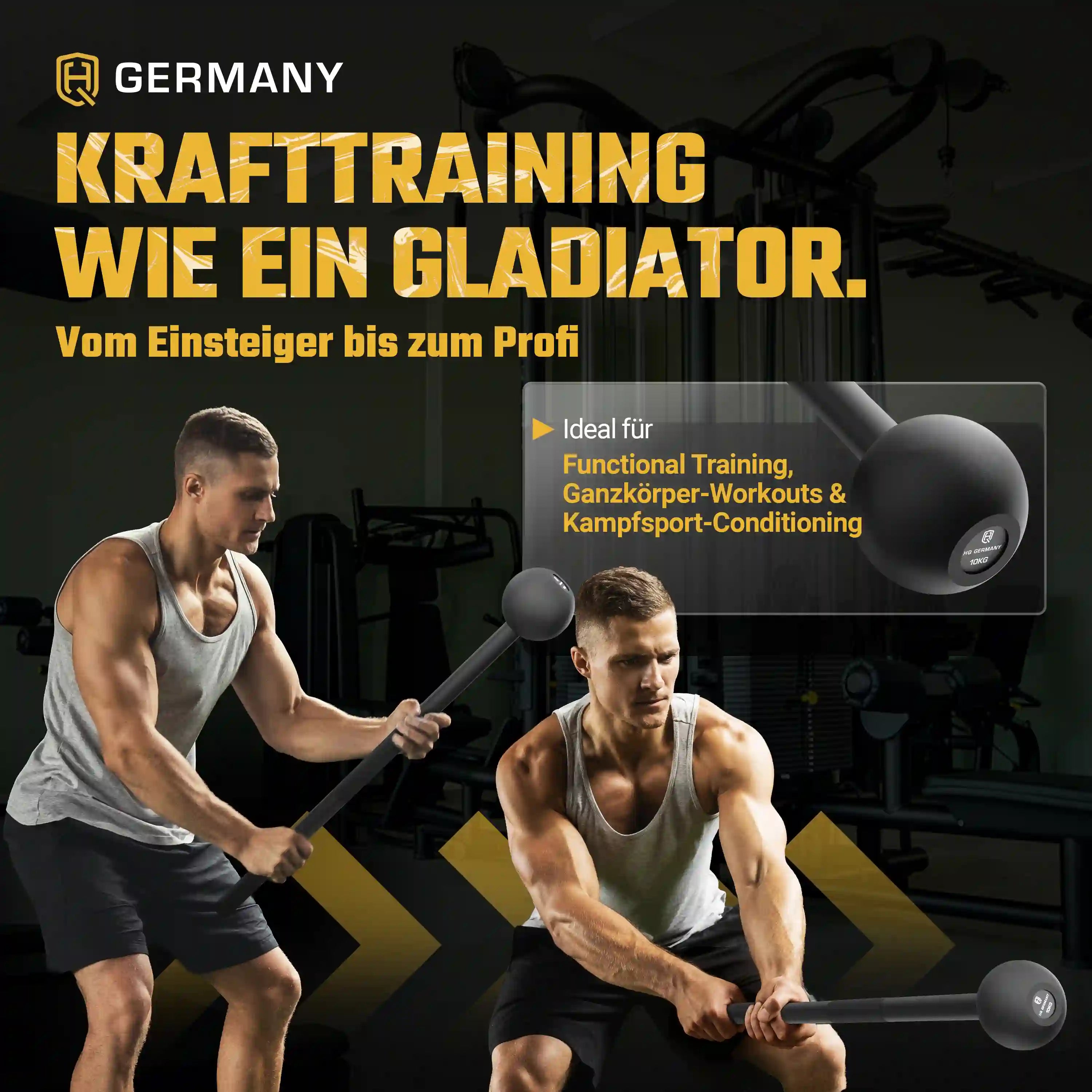 Die Macebells von HQ Germany sind perfekt für funktionelles Ganzkörpertraining – von Mobilitätsübungen bis hin zu intensivem Kraft- und Konditionstraining. Erhältlich in 2–10 kg bieten sie die ideale Progression für Einsteiger, Fortgeschrittene und Profis. Gefertigt aus massivem Qualitätsstahl und fest verschweißt, überzeugen die Macebells durch hohe Robustheit und eine Gewichtstoleranz von ±200 g. Die eingebrannte Pulverbeschichtung sorgt für eine langlebige, griffige Oberfläche, die selbst bei schweißtreibenden Workouts zuverlässig Halt gibt. Der Griff ist bei der 2-kg-Variante 605 mm lang mit Ø 32 mm; ab 4 kg misst er 930 mm mit Ø 40 mm. Zwei eingepresste Knurling-Segmente bieten zusätzlichen Grip ohne scharfe Kanten. So vereinen die HQ Germany Macebells präzise Fertigung, Langlebigkeit und vielseitige Einsatzmöglichkeiten – das Trainingswerkzeug für Athleten, die mehr erwarten.