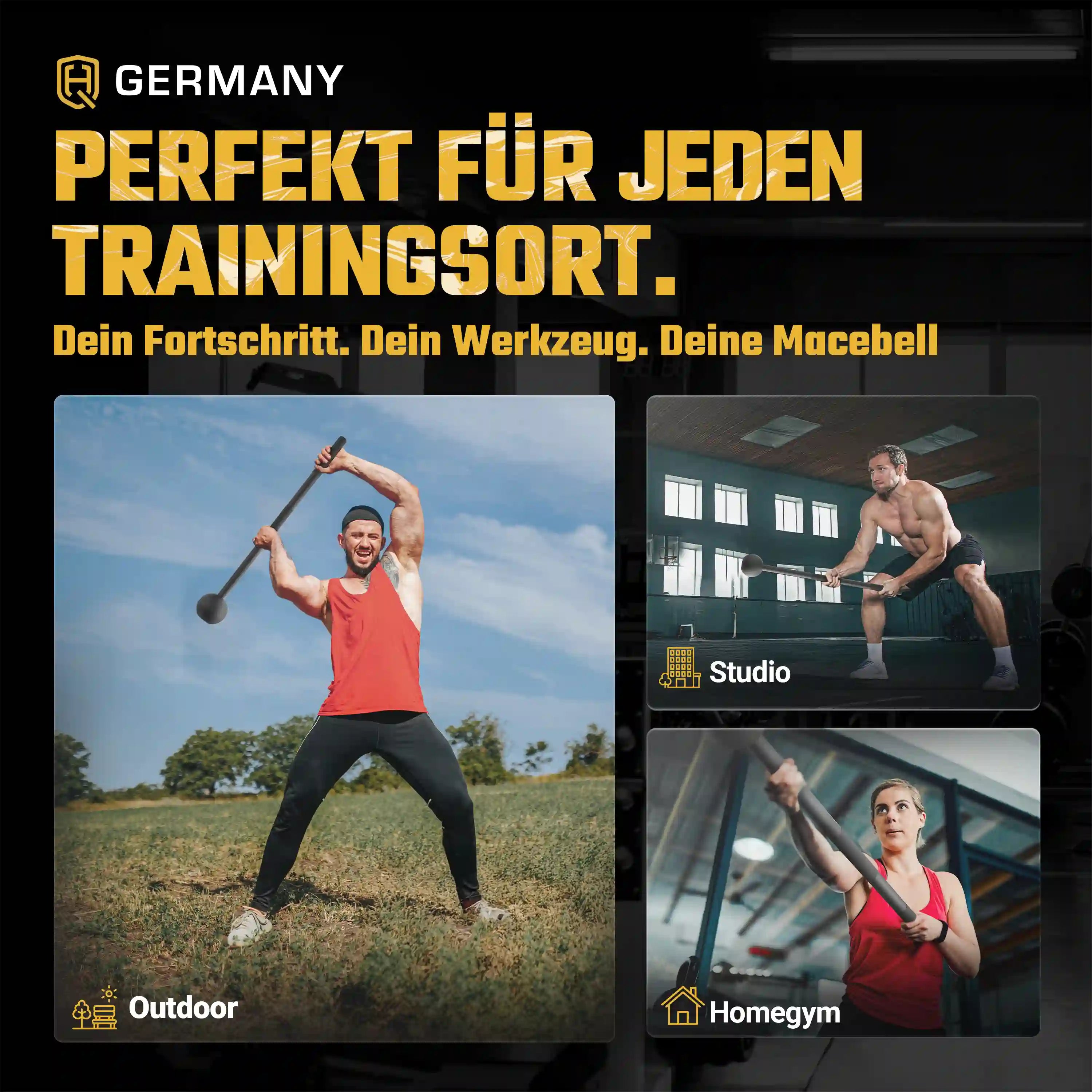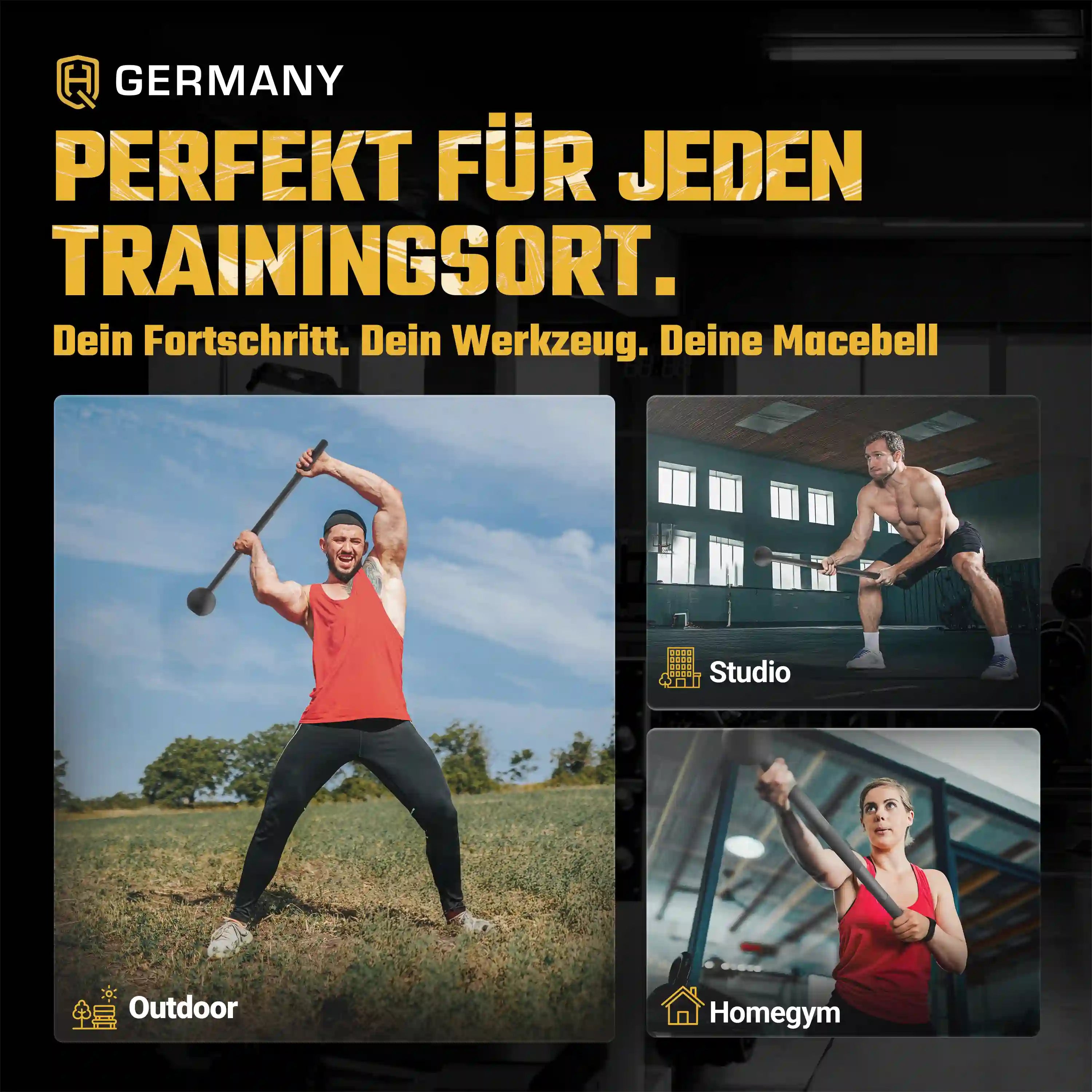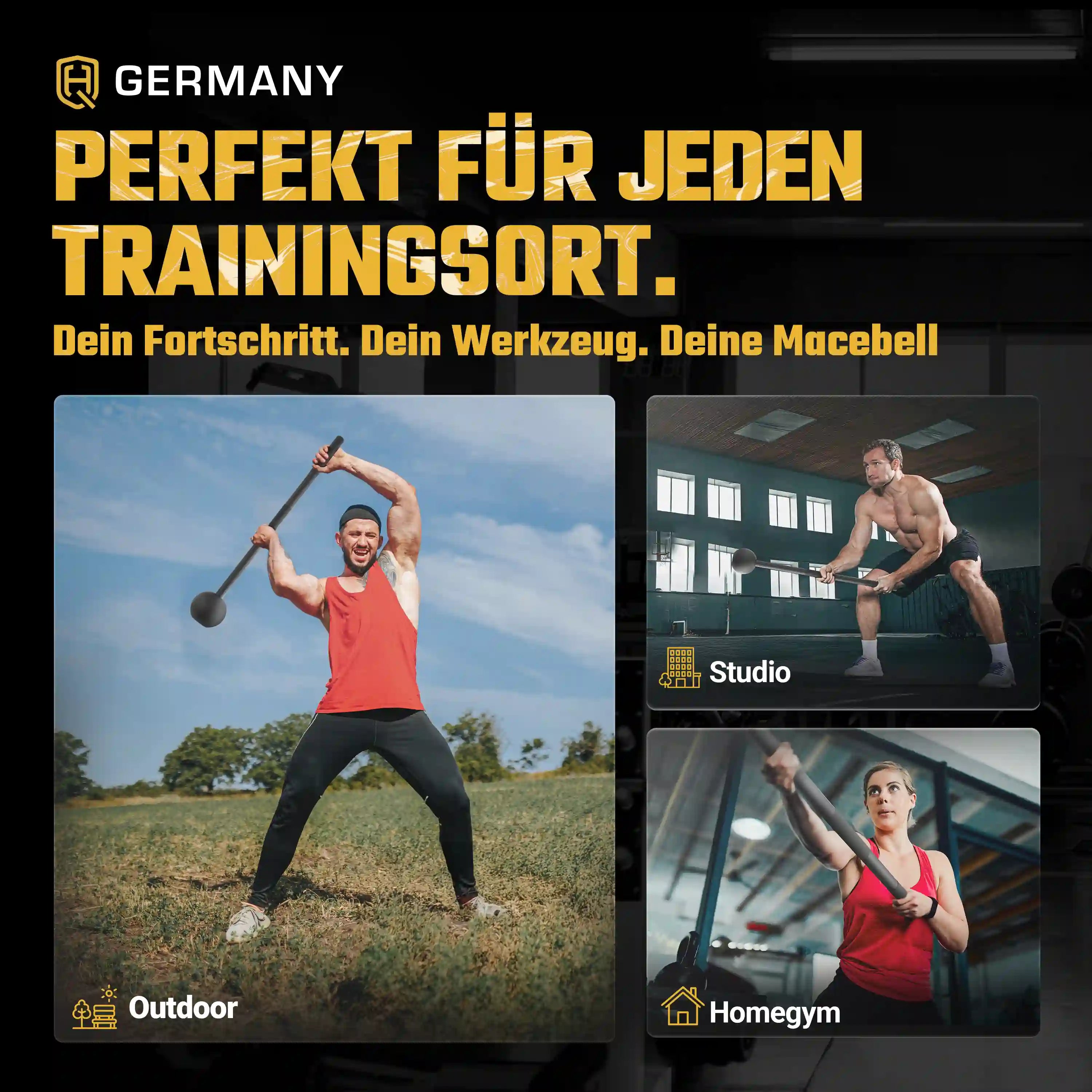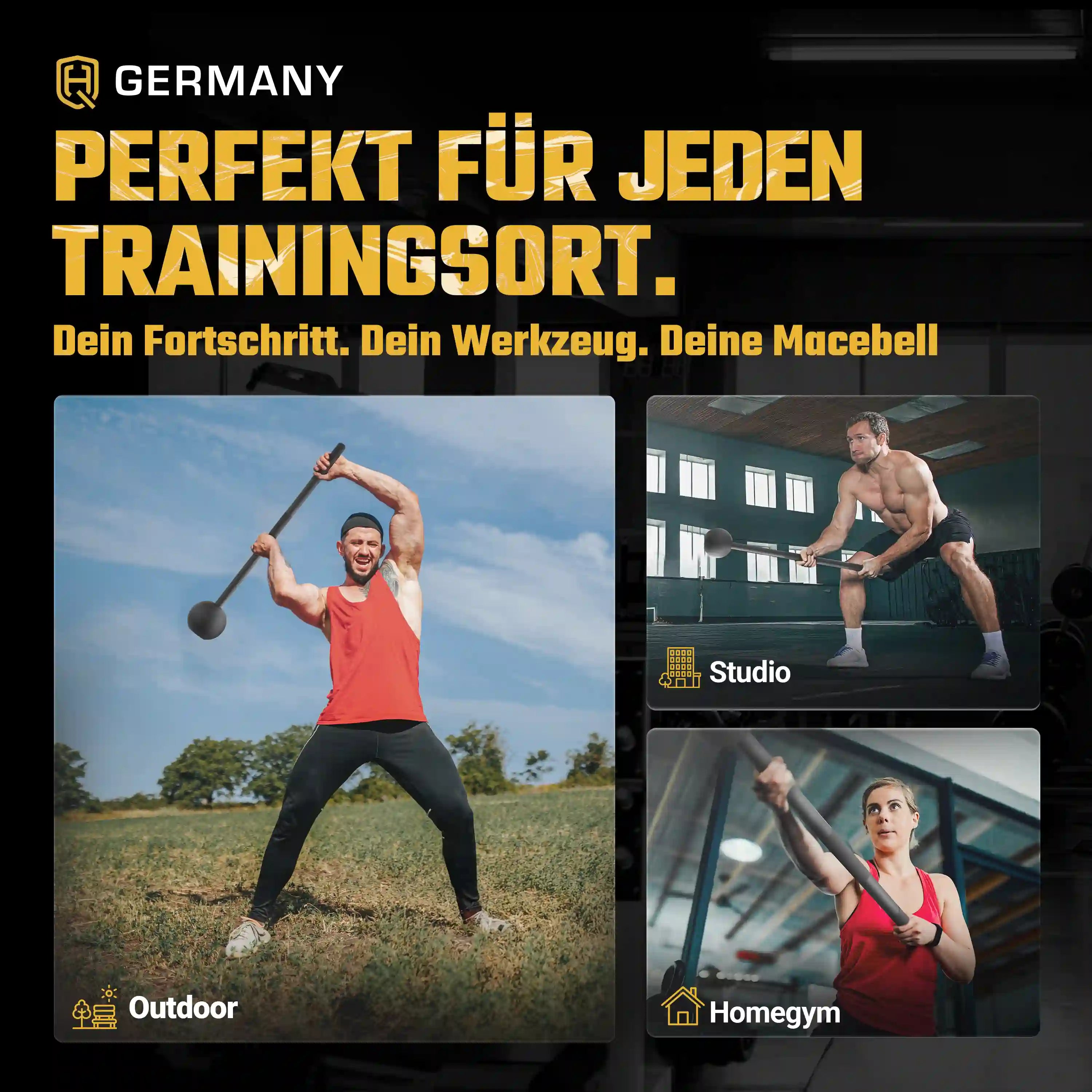Die Macebells von HQ Germany sind perfekt für funktionelles Ganzkörpertraining – von Mobilitätsübungen bis hin zu intensivem Kraft- und Konditionstraining. Erhältlich in 2–10 kg bieten sie die ideale Progression für Einsteiger, Fortgeschrittene und Profis. Gefertigt aus massivem Qualitätsstahl und fest verschweißt, überzeugen die Macebells durch hohe Robustheit und eine Gewichtstoleranz von ±200 g. Die eingebrannte Pulverbeschichtung sorgt für eine langlebige, griffige Oberfläche, die selbst bei schweißtreibenden Workouts zuverlässig Halt gibt. Der Griff ist bei der 2-kg-Variante 605 mm lang mit Ø 32 mm; ab 4 kg misst er 930 mm mit Ø 40 mm. Zwei eingepresste Knurling-Segmente bieten zusätzlichen Grip ohne scharfe Kanten. So vereinen die HQ Germany Macebells präzise Fertigung, Langlebigkeit und vielseitige Einsatzmöglichkeiten – das Trainingswerkzeug für Athleten, die mehr erwarten.