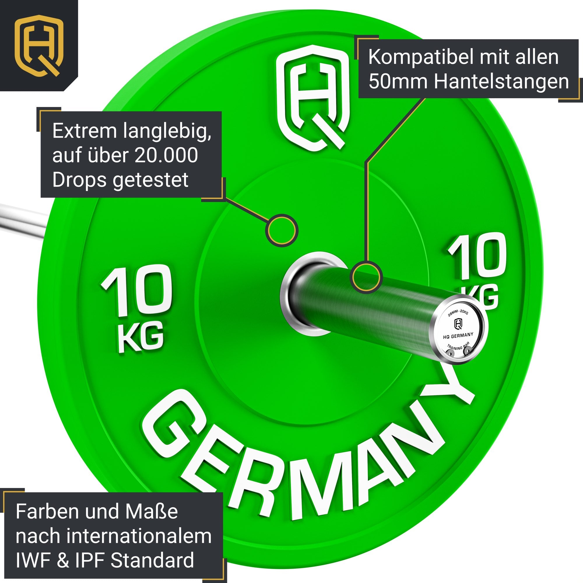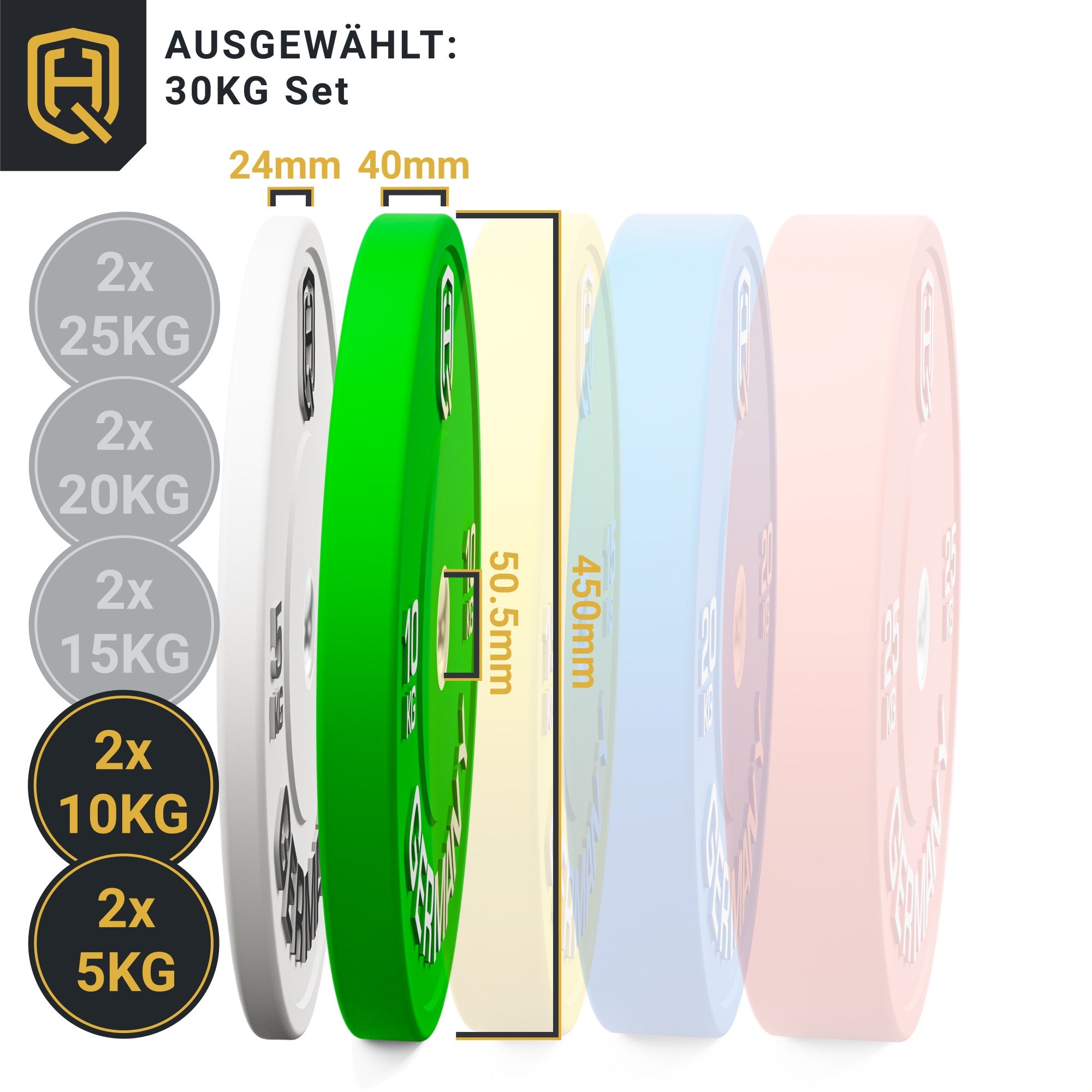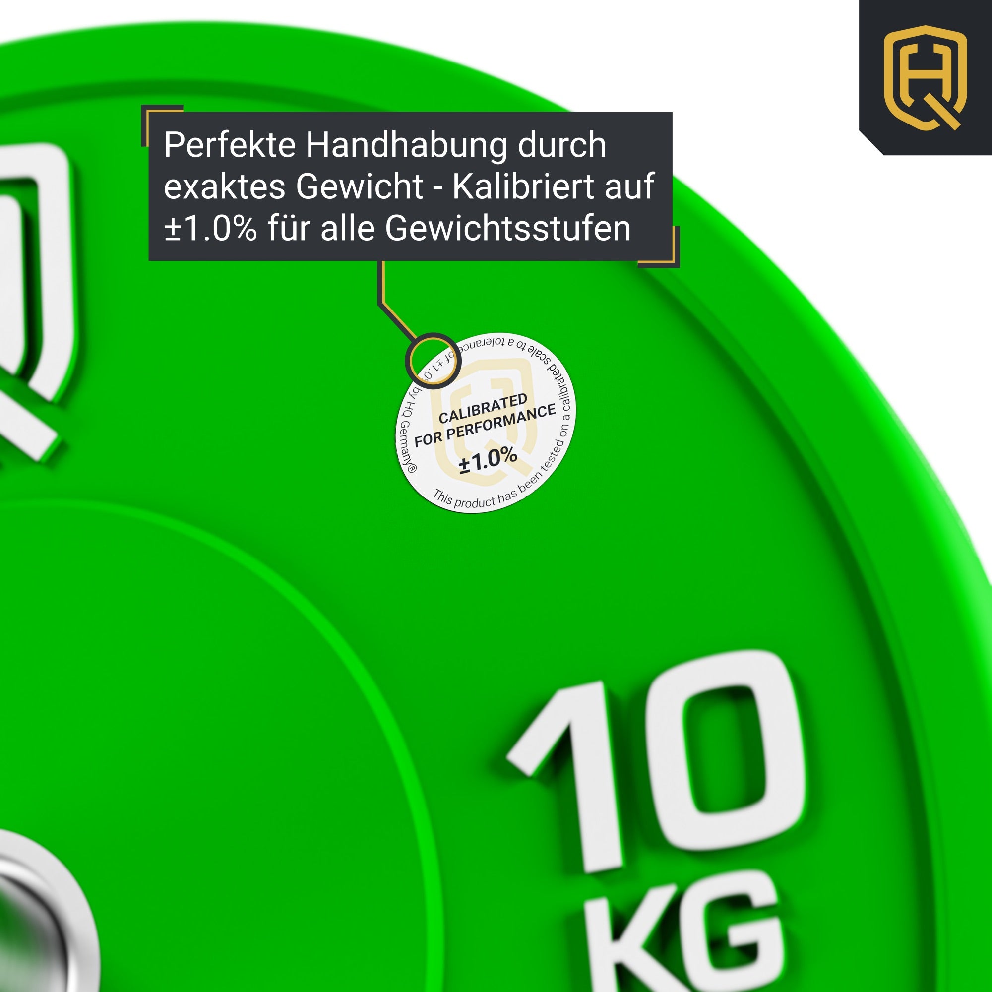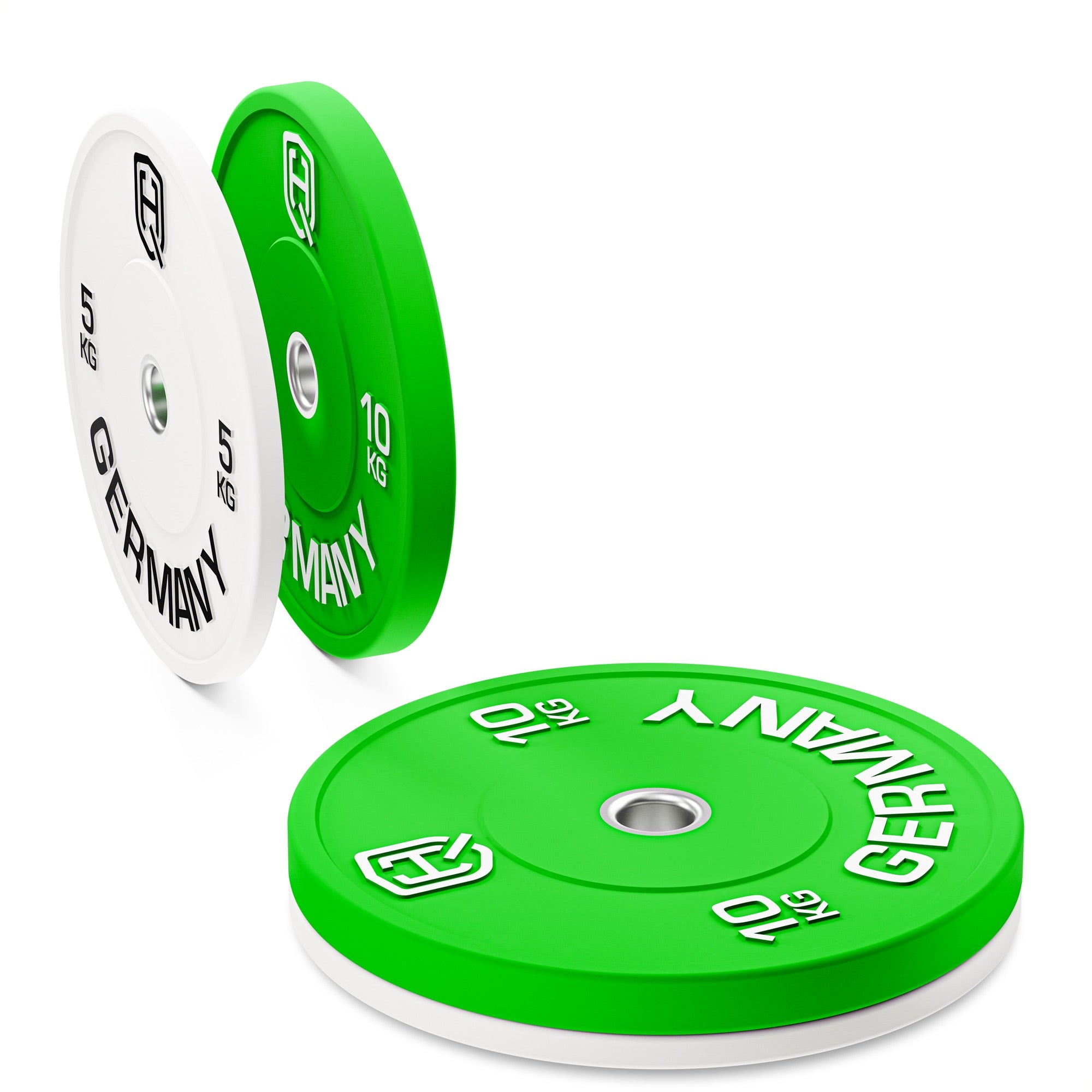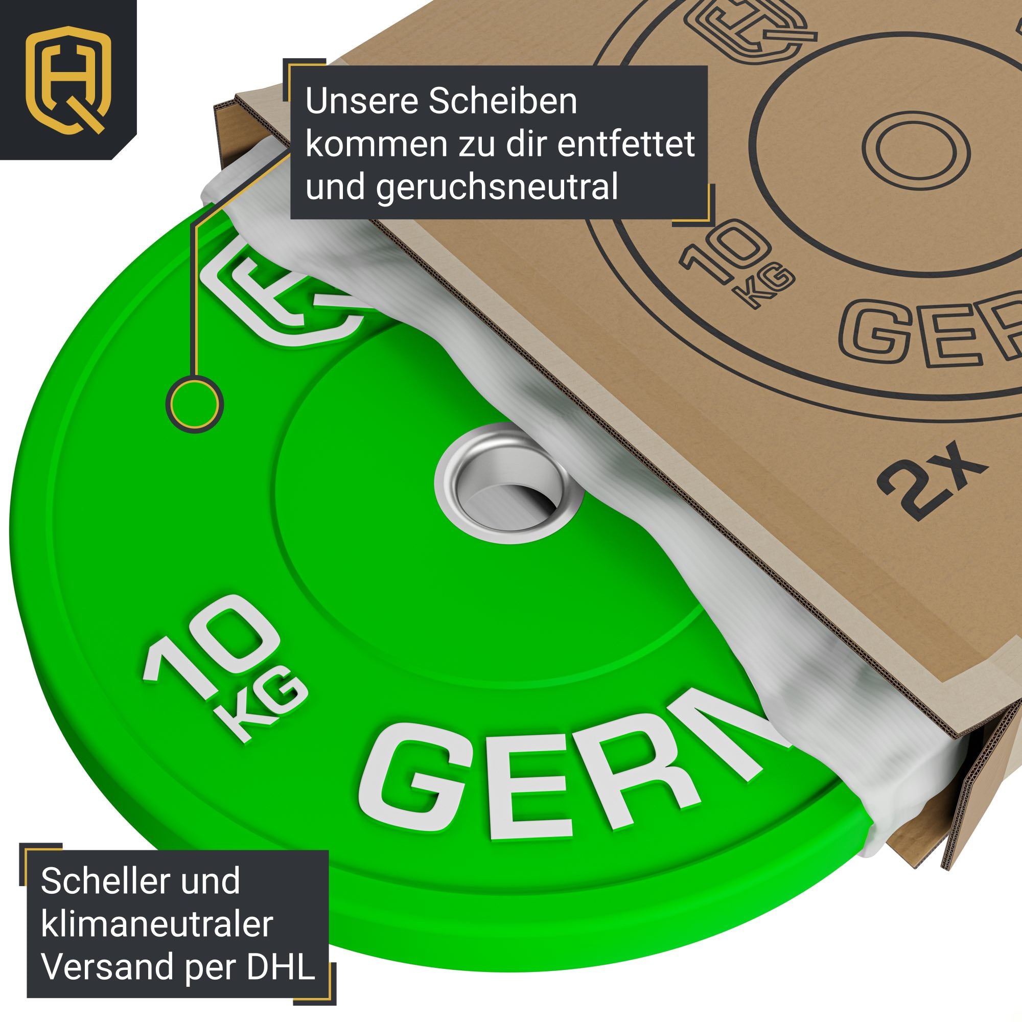 Die Olympic Bumper Plates von HQ Germany bieten dir alle Vorteile der Training Bumper Plates, jedoch mit einem entscheidenden Unterschied: Jedes Gewicht hat eine spezifische Farbe, die dem internationalen Standard entspricht. Dies ermöglicht eine schnellere und einfachere Identifikation während des Trainings. Diese hochwertigen Bumper Plates wurden mit höchster Präzision und Sorgfalt gefertigt und garantieren eine maximale Gewichtstoleranz von ±1,0 %. Der Durchmesser von 450 mm entspricht dem IWF-Standard, was sie ideal für professionelle Wettkämpfe macht. Die robusten Edelstahl-Hülsen sorgen für ein schnelles und einfaches Auf- und Abladen, während die Shore-A Härte von 90 für eine geringere Rückfederung sorgt. Ein weiterer Pluspunkt: Sie sehen wirklich klasse aus! Das auffällige Design mit dem weißen Logo sorgt dafür, dass deine Ausrüstung nicht nur funktional, sondern auch ein echter Hingucker ist. Investiere in die Olympic Bumper Plates und bring dein Training auf die nächste Stufe!
