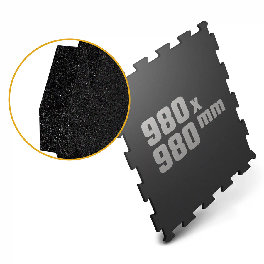 Die präzise verzahnte Puzzleverbindung sorgt für eine saubere, einheitliche Fläche mit sicherem Halt. Durch das größere Format lässt sich der Boden noch effizienter verlegen, insbesondere bei Studios oder Hallen mit hoher Quadratmeterzahl.