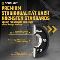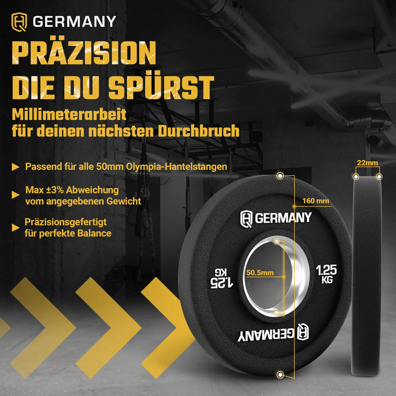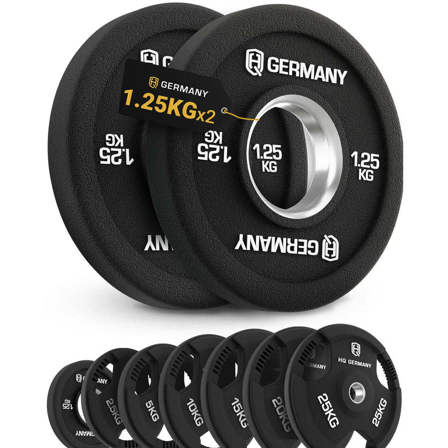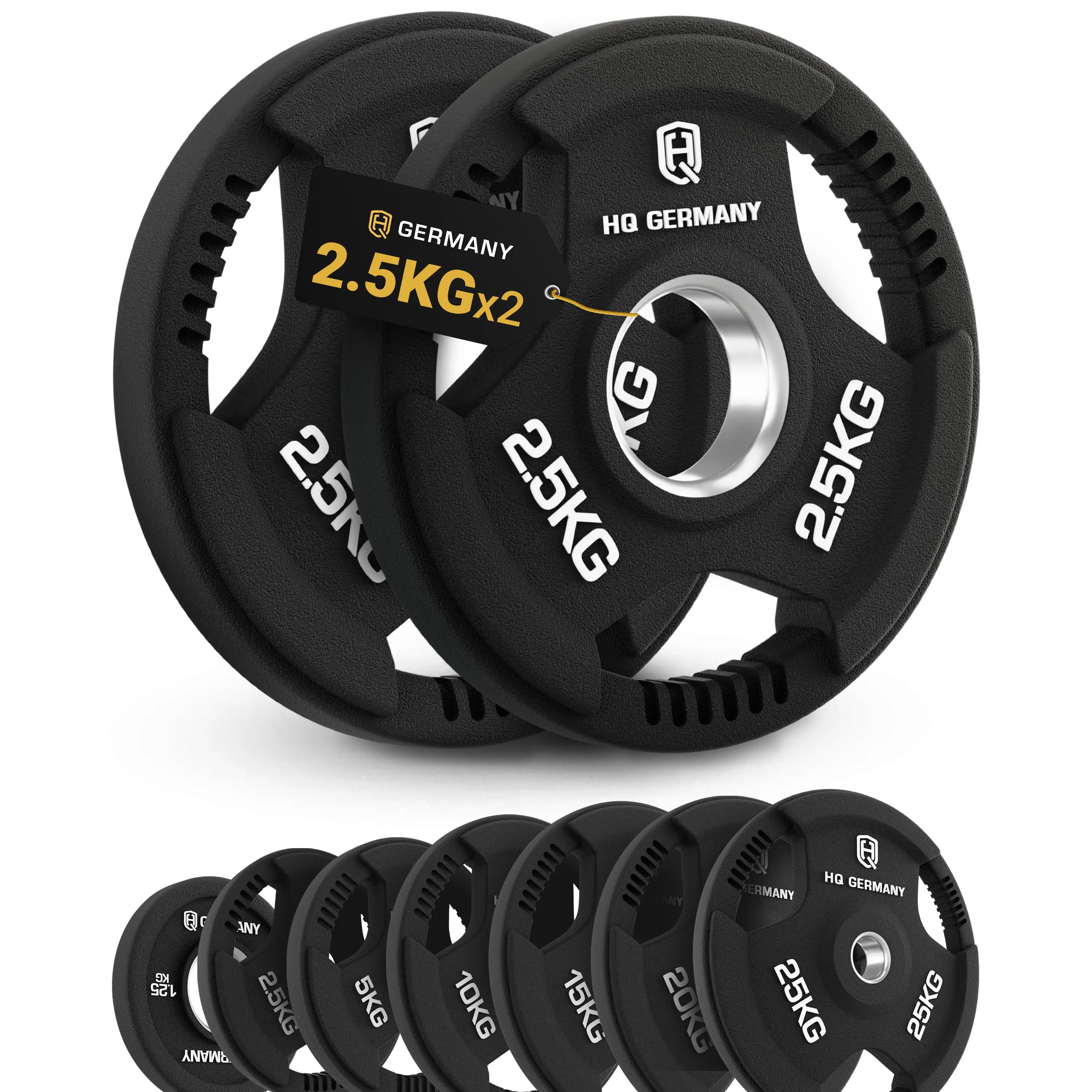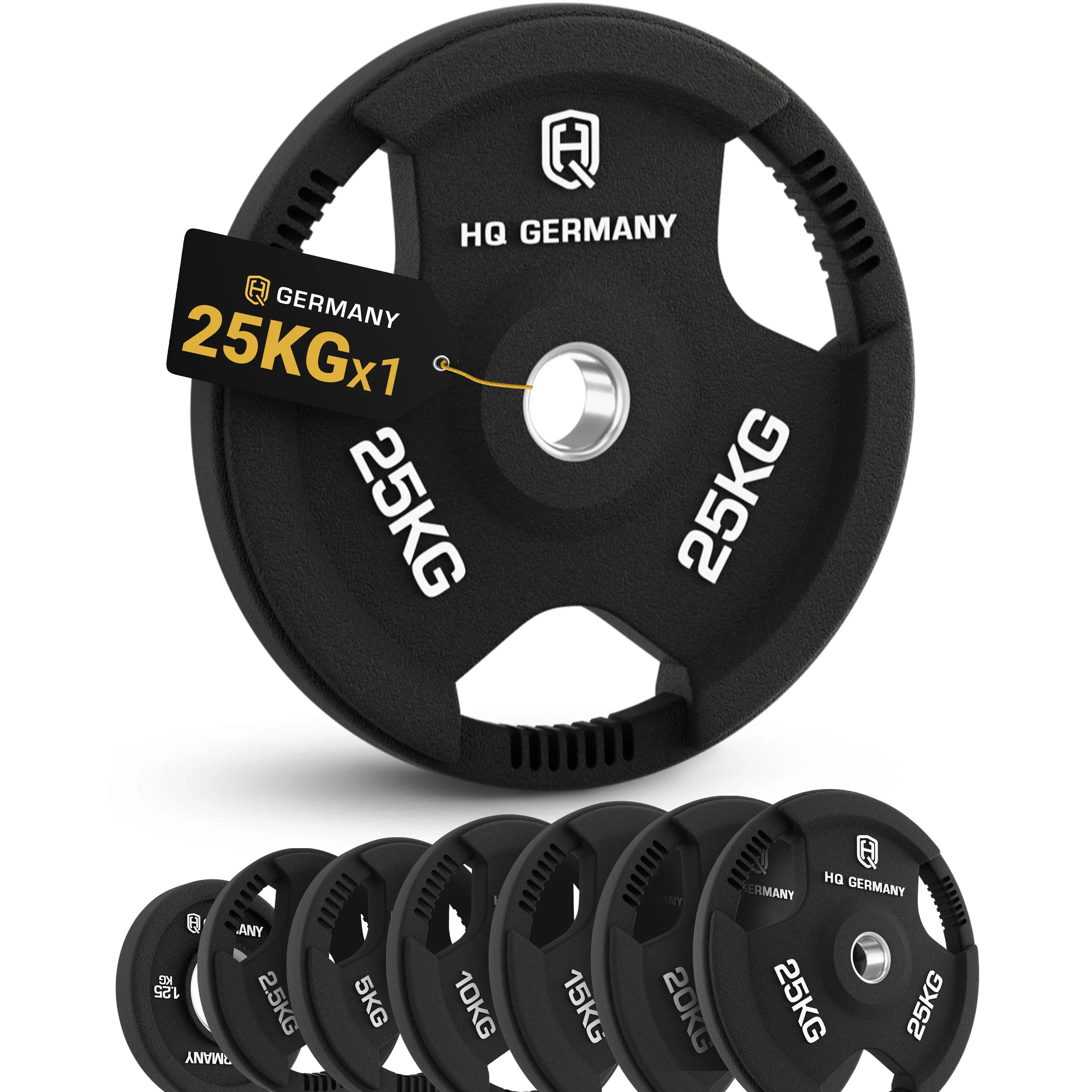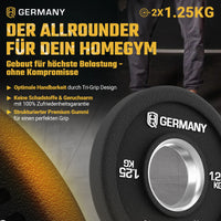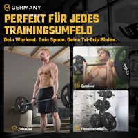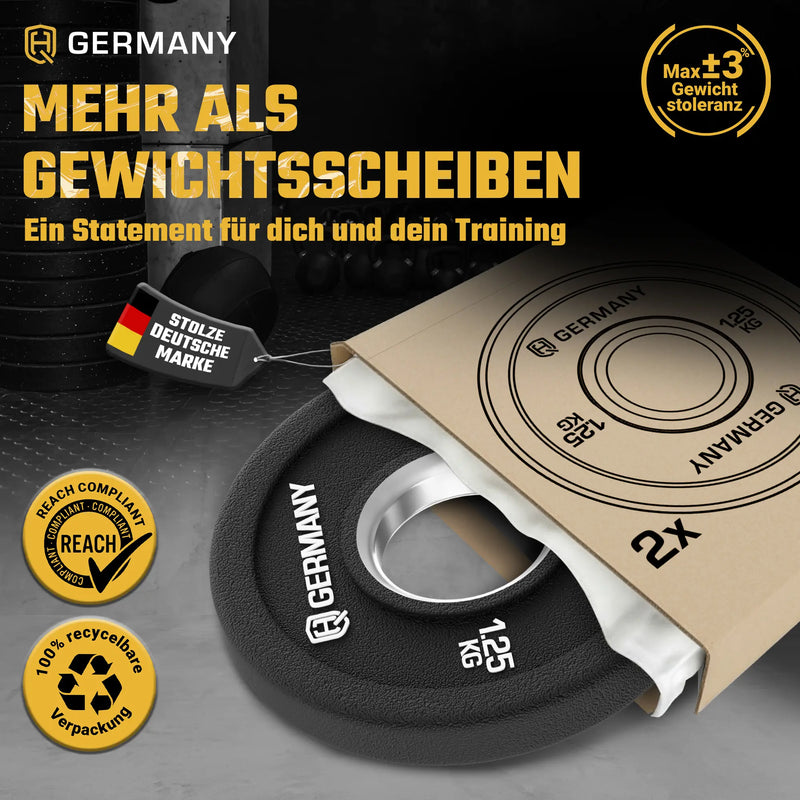 Die HQ Germany Tri-Grip Plates sind mehr als nur Gewichtsscheiben – sie sind ein Statement für dein Training. Entwickelt für maximale Vielseitigkeit, begleiten sie dich zuverlässig zu Hause, im Studio oder outdoor. Egal ob Einsteiger oder Technik-Nerd: Diese Plates passen sich deinem Trainingsstil an und liefern genau das Gefühl, das du bei jeder Wiederholung suchst. Das durchdachte Tri-Grip-Design ermöglicht ein sicheres und komfortables Handling – nicht nur auf der Langhantel, sondern auch bei freien Übungen ohne Hantel. So eröffnen sich dir zusätzliche Trainingsmöglichkeiten für funktionelles Krafttraining, Core-Arbeit und Mobility. Die griffige Oberfläche sorgt dabei für volle Kontrolle, auch bei schweißtreibenden Sessions. Im Inneren sorgt ein Vollguss-Eisenkern für hohe Haltbarkeit und langfristige Belastbarkeit, während die robuste Gummibeschichtung Boden, Equipment und Nerven schont. Die hochwertigen Edelstahlhülsen garantieren ein präzises Auf- und Abladen und sind mit allen 50 mm Olympia-Langhantelstangen kompatibel. Mit einer Gewichtstoleranz von max. ±3 % trainierst du zuverlässig und ausgewogen. Optisch überzeugen die Tri-Grip Plates mit klaren, angehobenen Gewichtsangaben und einem hochwertigen Finish. Die geruchsarme, schadstofffreie Gummimischung (REACH-konform) macht sie ideal für den Einsatz im Wohnraum. Abgerundet wird das Gesamtpaket durch eine 100 % recycelbare Verpackung. Ob schweres Krafttraining, funktionelle Einheiten oder vielseitige Home-Gym-Workouts – die HQ Germany Tri-Grip Plates stehen für Präzision, Vielseitigkeit und kompromisslose Qualität. Dein Workout. Dein Space. Deine Plates.