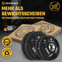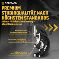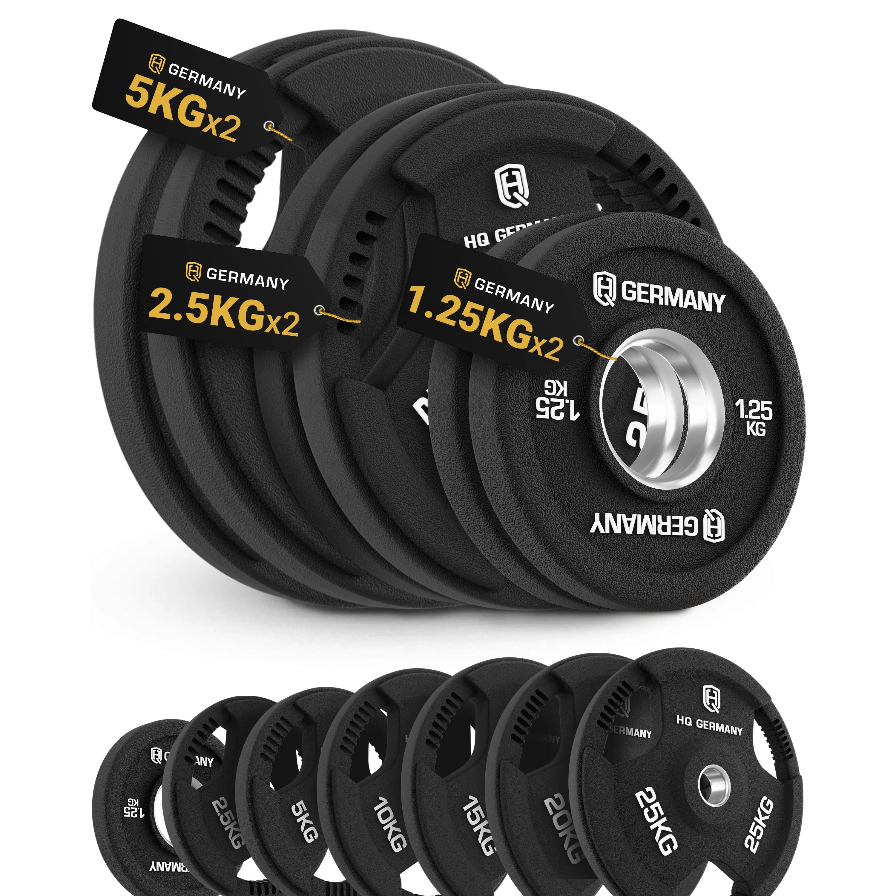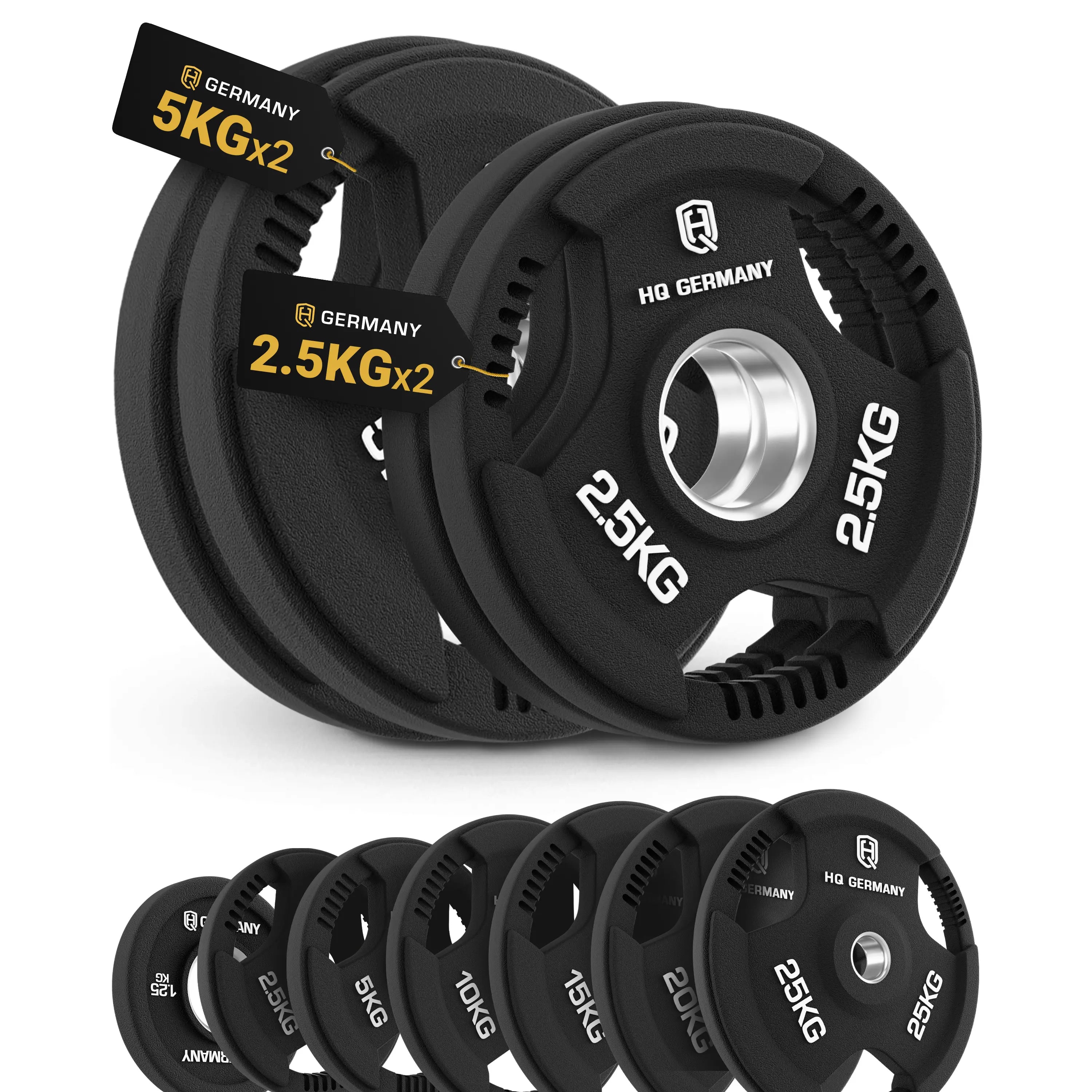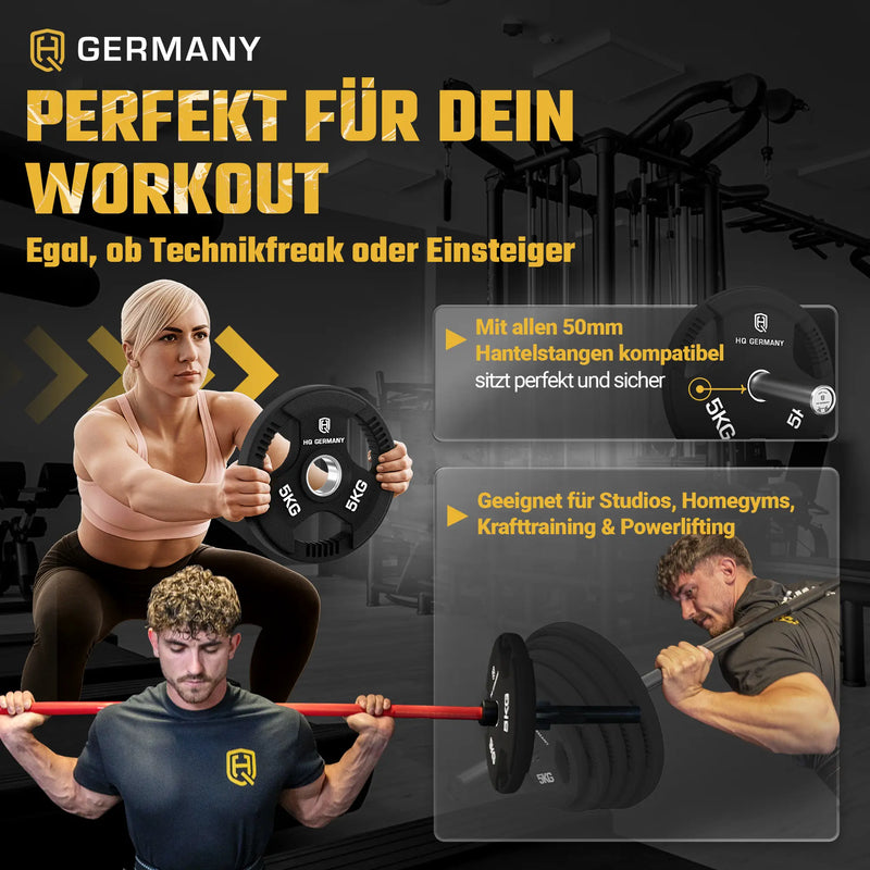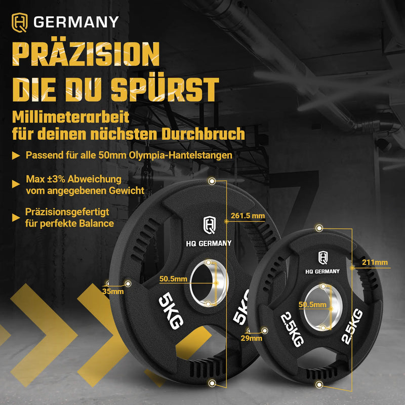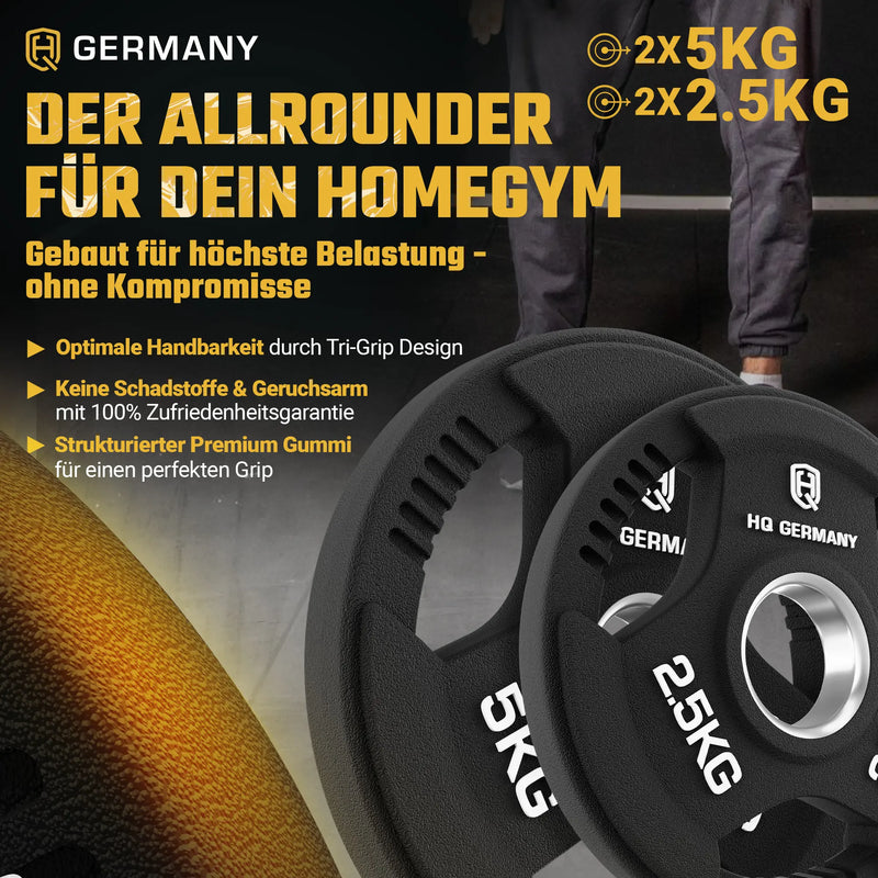 Die HQ Germany Tri-Grip Plates sind mehr als nur Gewichtsscheiben – sie sind ein Statement für dein Training. Entwickelt für maximale Vielseitigkeit, begleiten sie dich zuverlässig zu Hause, im Studio oder outdoor. Egal ob Einsteiger oder Technik-Nerd: Diese Plates passen sich deinem Trainingsstil an und liefern genau das Gefühl, das du bei jeder Wiederholung suchst. Das durchdachte Tri-Grip-Design ermöglicht ein sicheres und komfortables Handling – nicht nur auf der Langhantel, sondern auch bei freien Übungen ohne Hantel. So eröffnen sich dir zusätzliche Trainingsmöglichkeiten für funktionelles Krafttraining, Core-Arbeit und Mobility. Die griffige Oberfläche sorgt dabei für volle Kontrolle, auch bei schweißtreibenden Sessions. Im Inneren sorgt ein Vollguss-Eisenkern für hohe Haltbarkeit und langfristige Belastbarkeit, während die robuste Gummibeschichtung Boden, Equipment und Nerven schont. Die hochwertigen Edelstahlhülsen garantieren ein präzises Auf- und Abladen und sind mit allen 50 mm Olympia-Langhantelstangen kompatibel. Mit einer Gewichtstoleranz von max. ±3 % trainierst du zuverlässig und ausgewogen. Optisch überzeugen die Tri-Grip Plates mit klaren, angehobenen Gewichtsangaben und einem hochwertigen Finish. Die geruchsarme, schadstofffreie Gummimischung (REACH-konform) macht sie ideal für den Einsatz im Wohnraum. Abgerundet wird das Gesamtpaket durch eine 100 % recycelbare Verpackung. Ob schweres Krafttraining, funktionelle Einheiten oder vielseitige Home-Gym-Workouts – die HQ Germany Tri-Grip Plates stehen für Präzision, Vielseitigkeit und kompromisslose Qualität. Dein Workout. Dein Space. Deine Plates.